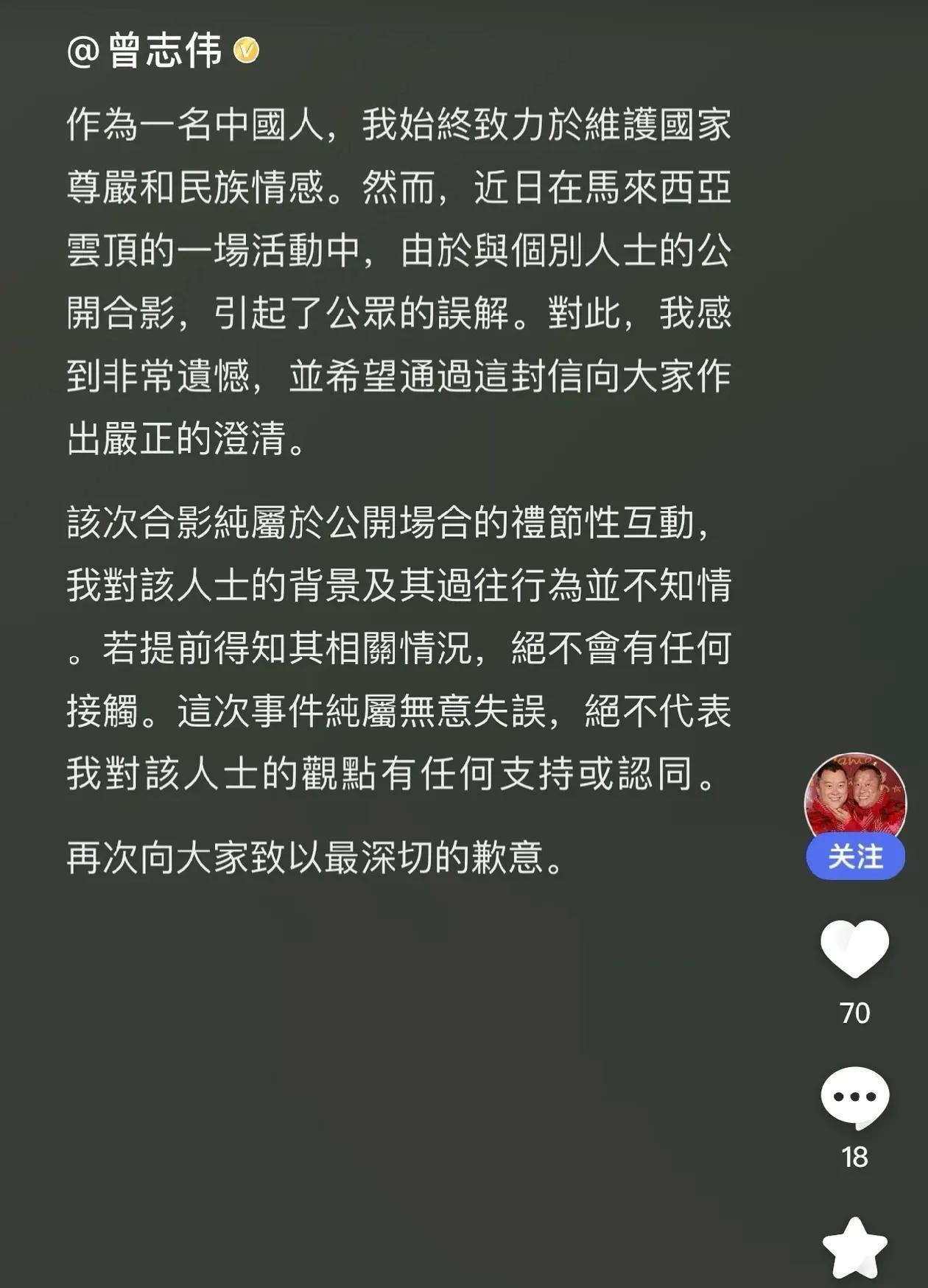 钟镇涛和曾志伟是真怕了吧!俩人一起发了道歉信,都说自己是坚决爱国的,是不是出什么大事了? 说是在马来西亚的一个活动上,他俩不知情跟某个人合了影。那这个“某人”到底是谁啊?是不是这人出事了,所以他俩现在赶紧想撇清关系? 不至于吧,就合个影而已,还用得着道歉?其实钟镇涛根本不用道歉,大家都信得过他。可曾志伟道歉估计也没用,他的信誉早在蓝洁瑛那事上就没了。曾志伟干这事也不是头一回了,缅北的白老大过生日的时候,他好像发过祝福视频。这次又出这事,要说他没问题,我真的不信。