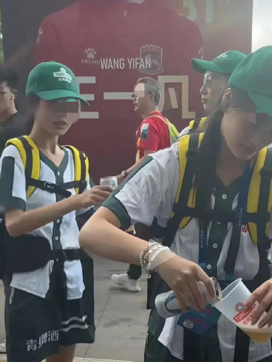 苏超赛场周边出现了卖啤酒的小妹妹,还有外国小妹,她们背着酒桶,四处游走,为球迷献