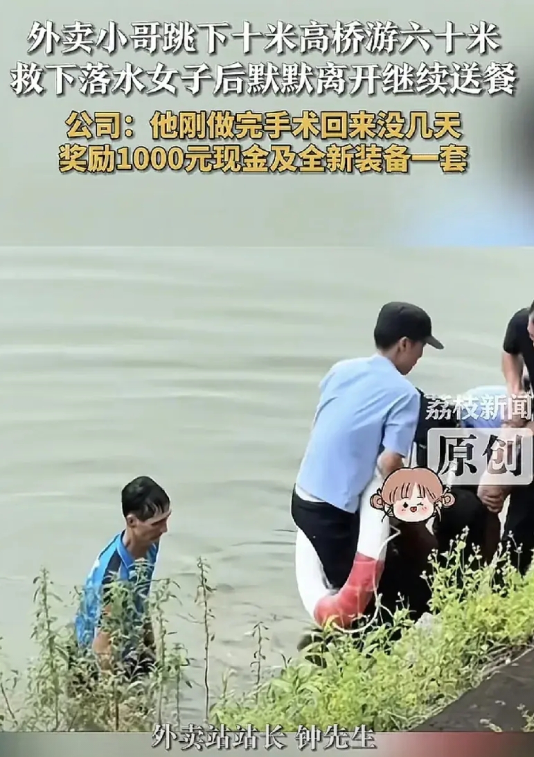 7月18号,广东茂名高州,一名50岁的外卖小哥刚刚在车站收完餐,在路过鉴江河的时候看到很多人在桥边围观,他一看,原来河面上有一个人浮浮沉沉的,知道这个人是溺水了,他立马把车停了下来,把头盔和鞋子脱了,爬上了护栏,毫不犹豫的从10米多高的桥上面往下跳,然后游了大概五六十米成功的把溺水的妇女拖到了岸边,妇女在民警的辅助下被拉了上岸,外卖小哥救完人之后摆了摆手说:“还有单要送。”然后就穿着湿漉漉的衣服继续去送餐。