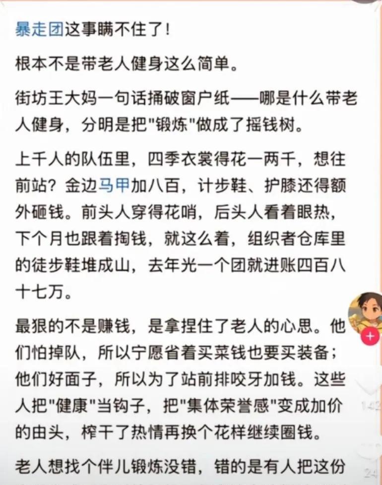 暴走团什么玩意?就是一群吃饱了没事干又要找存在感的退休老头老太太,刷存在感也没关系,但你不能影响其他人的正常工作和生活