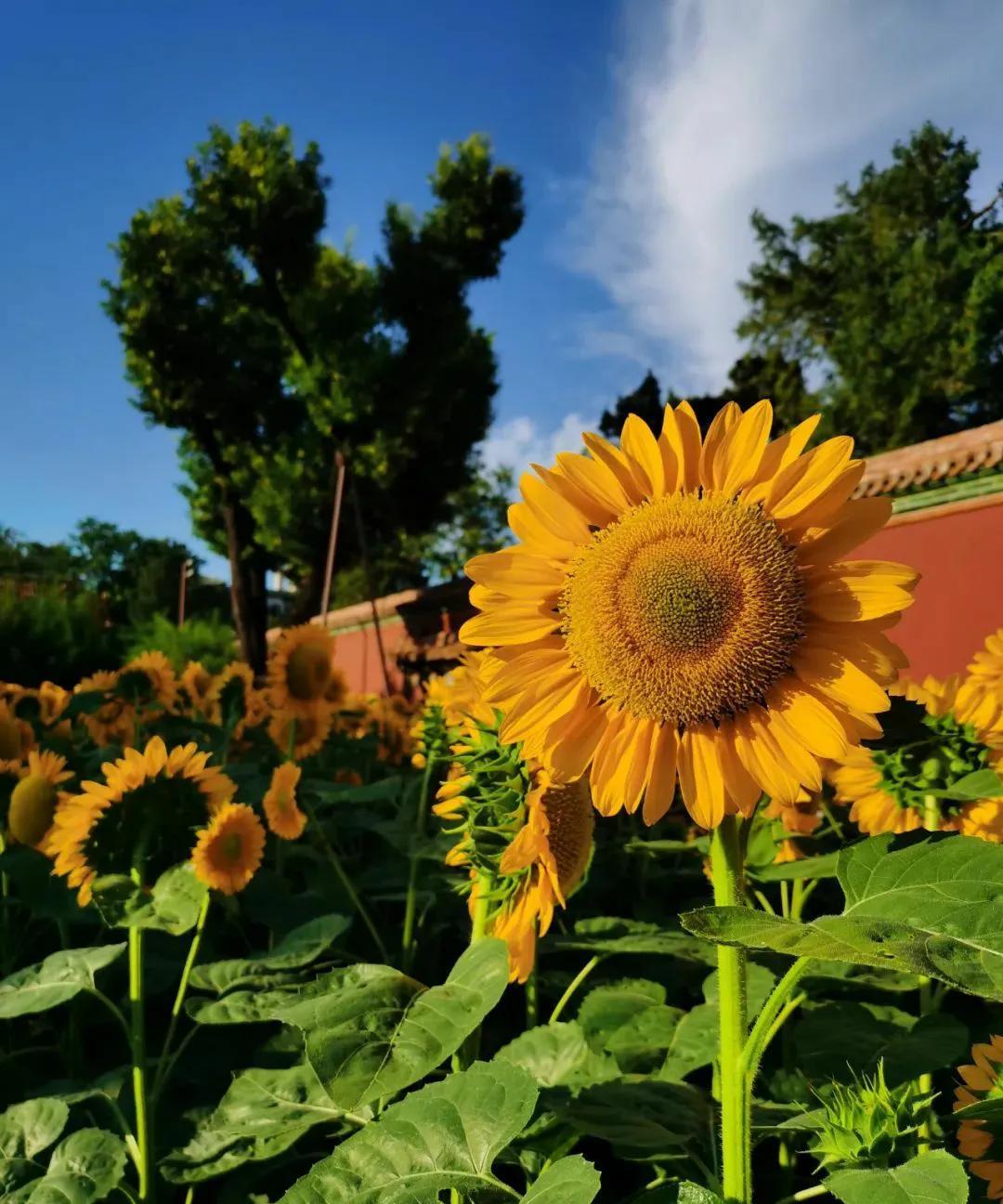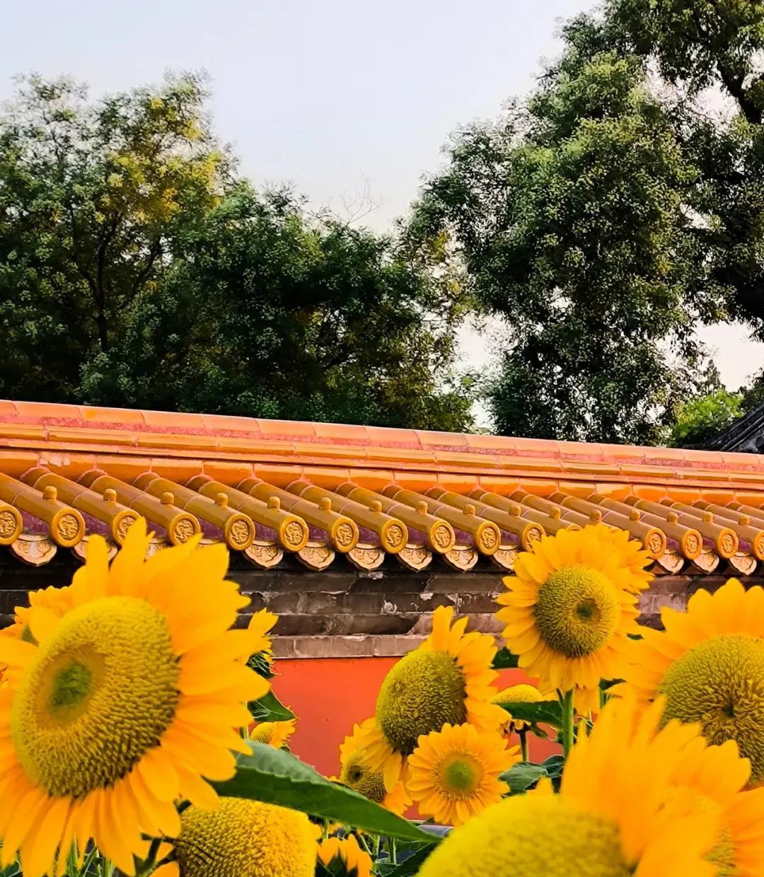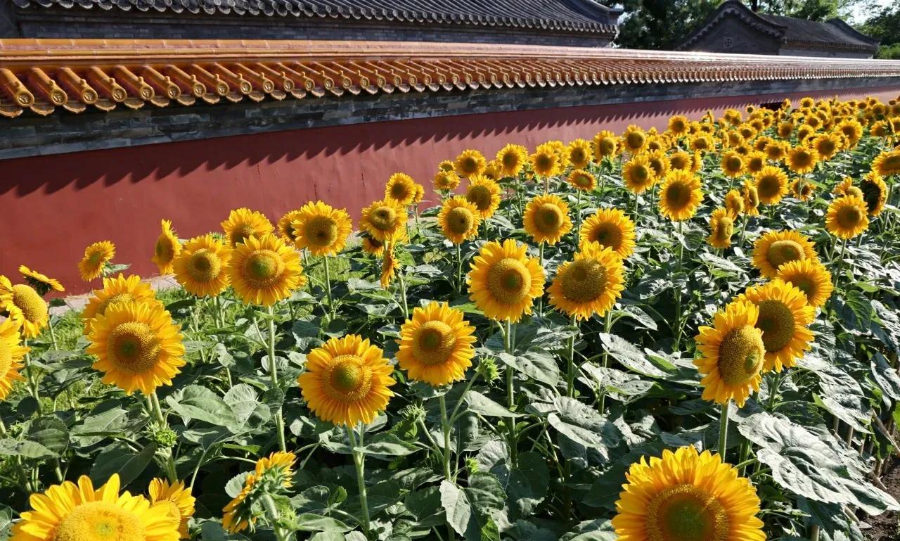 北京景山公园的向日葵花开绚烂 炎炎夏日,继北京奥森公园向日葵 花开壮丽之后,北京景山公园的向日葵花海也进入盛花期,公园西区科普园内约2000平方米的向日葵花海,在科技人员的倾力打造下花开艳丽。精选的“惊喜阳光”、“炸裂阳光”、“金富贵”三大优良品种,迎着阳光盛开,在夏风中自信地摇戈,形成一道优美亮丽的风景线! 与奥森公园具有壮美田园风光的向日葵花海相比,景山公园绽放在皇家园林红墙黄瓦边的向日葵,更多了几分自信飘逸的古典之美。昂首向天绽放着金色笑脸的向日葵,与古色古香的万春亭、朱红的故宫宫墙交相辉映,宛如一幅极具传统意蕴之美的壮丽画卷。站在金色花海前拍照,轻松定格难忘瞬间! #分享城市新鲜事#