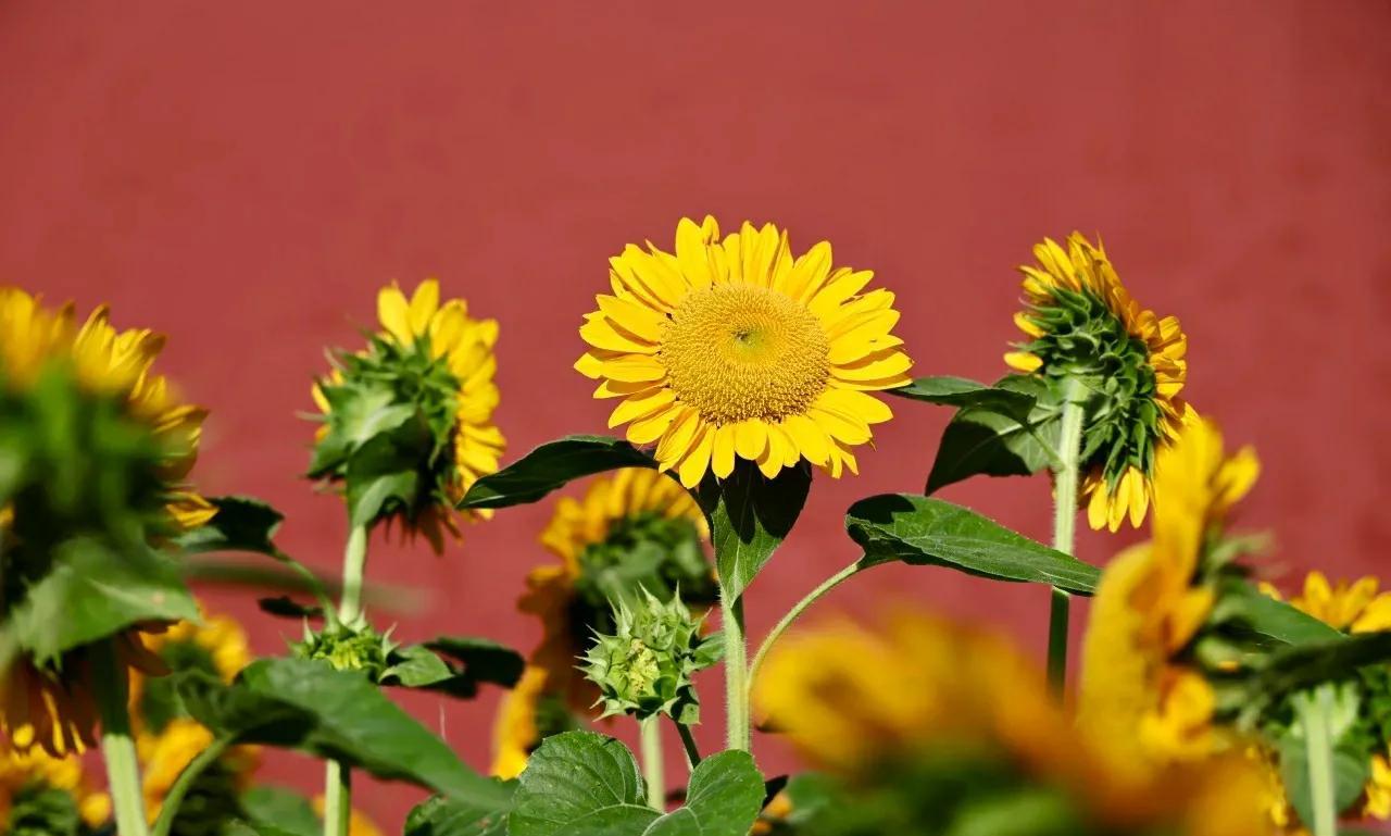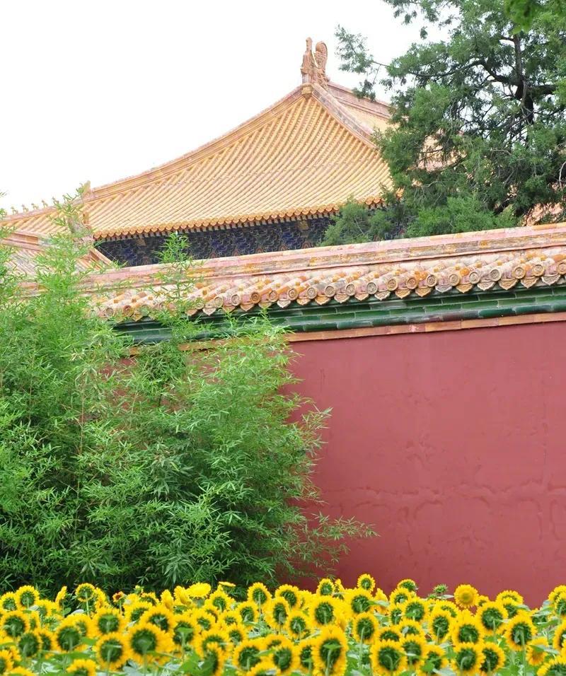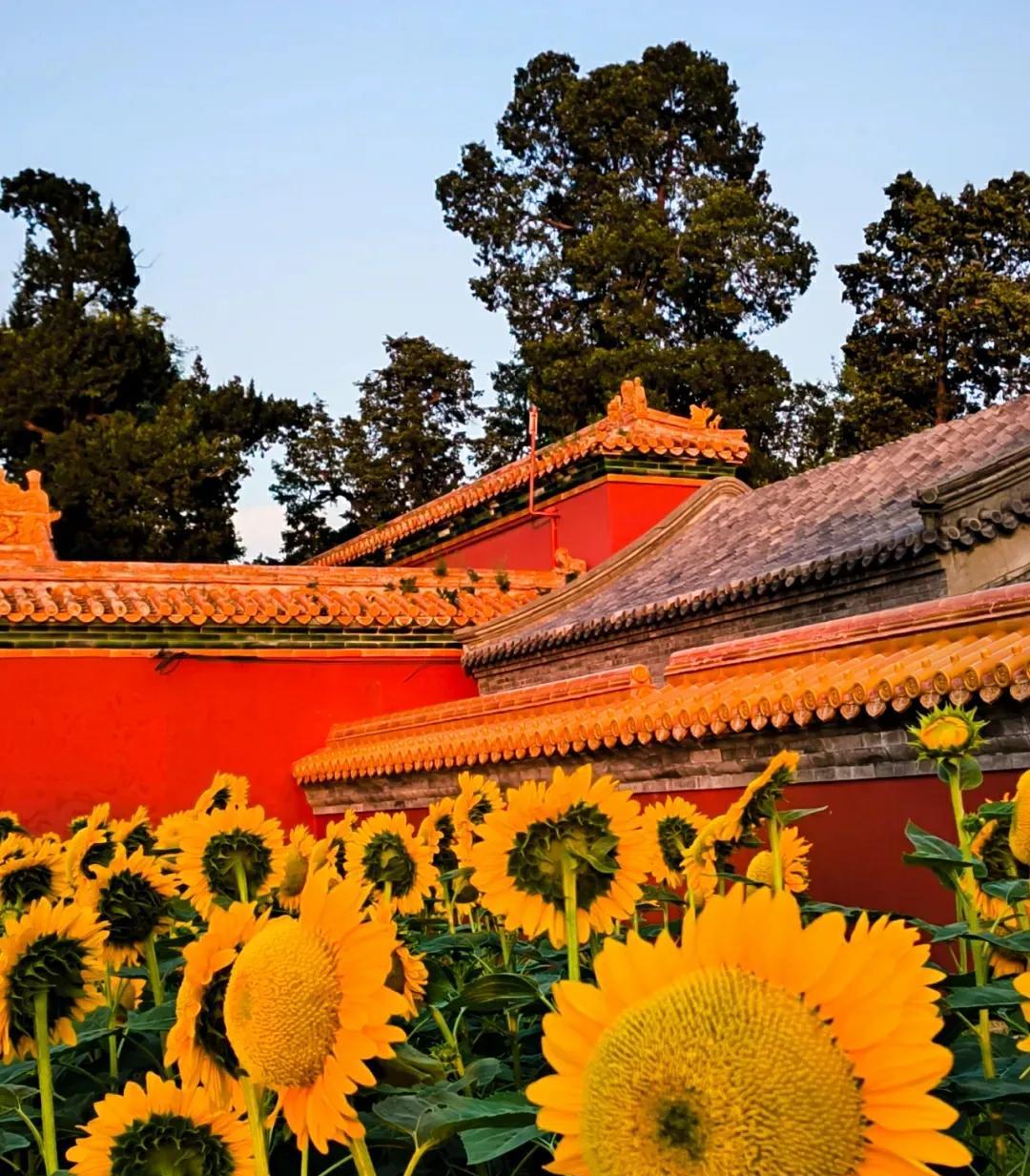 北京景山公园的向日葵花开绚烂 炎炎夏日,继北京奥森公园向日葵 花开壮丽之后,北京景山公园的向日葵花海也进入盛花期,公园西区科普园内约2000平方米的向日葵花海,在科技人员的倾力打造下花开艳丽。精选的“惊喜阳光”、“炸裂阳光”、“金富贵”三大优良品种,迎着阳光盛开,在夏风中自信地摇戈,形成一道优美亮丽的风景线! 与奥森公园具有壮美田园风光的向日葵花海相比,景山公园绽放在皇家园林红墙黄瓦边的向日葵,更多了几分自信飘逸的古典之美。昂首向天绽放着金色笑脸的向日葵,与古色古香的万春亭、朱红的故宫宫墙交相辉映,宛如一幅极具传统意蕴之美的壮丽画卷。站在金色花海前拍照,轻松定格难忘瞬间! #分享城市新鲜事#
