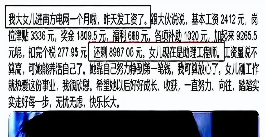 刚入职南方电网一个月,工资竟然8987,网友:可以举报了! 朋友的女儿入职南方电网,刚发工资就在朋友圈炫耀,第一个月扣除个税等8987元,表示很欣慰。 有网友评论,南方电网的福利真不错,基本工资才2412,可最后拿到手竟将近9000,这一般企业是无法比的。 您认为这工资咋样?#电网收入待遇# #南方电网待遇# #南方电网总公司# #南方电网招聘#