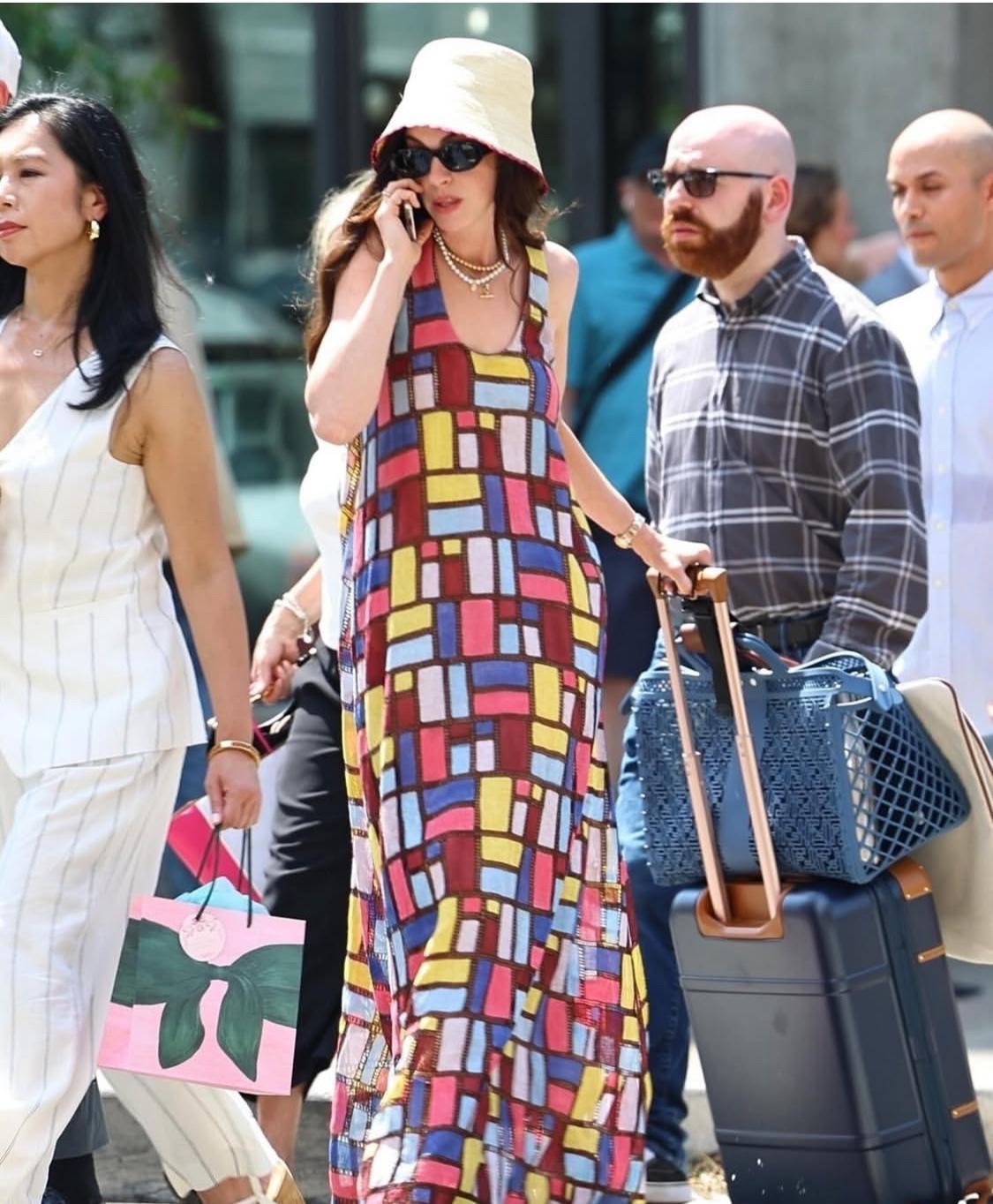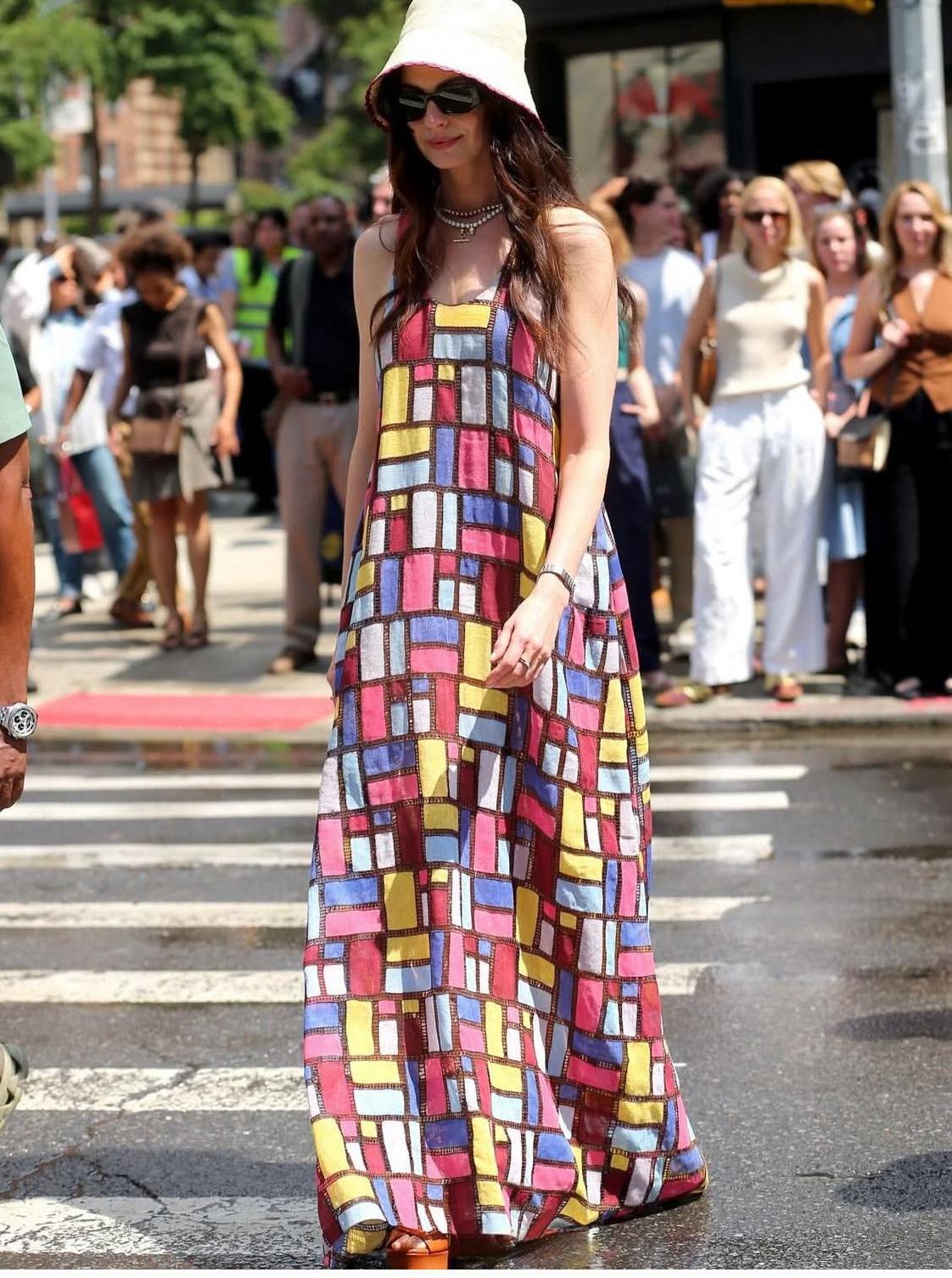 安妮·海瑟薇回归《穿普拉达的女王2》纽约开拍,街头造型抢先看!彩色几何图案长裙搭