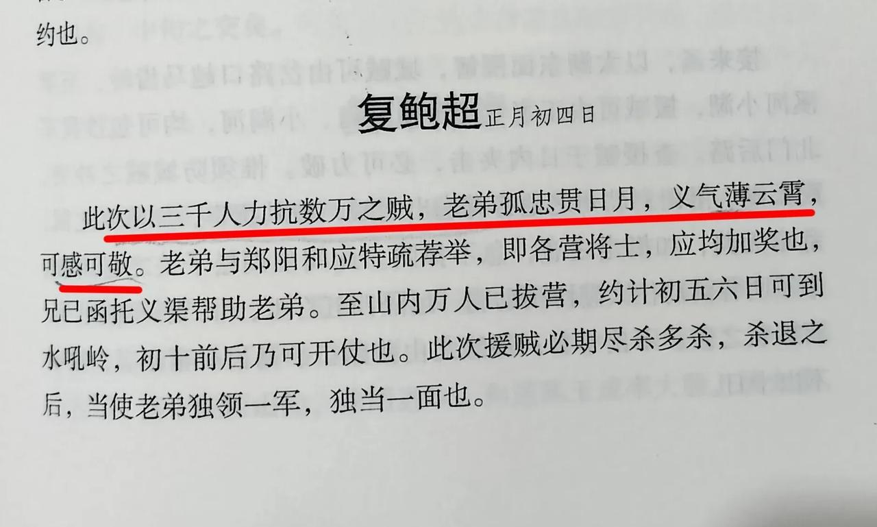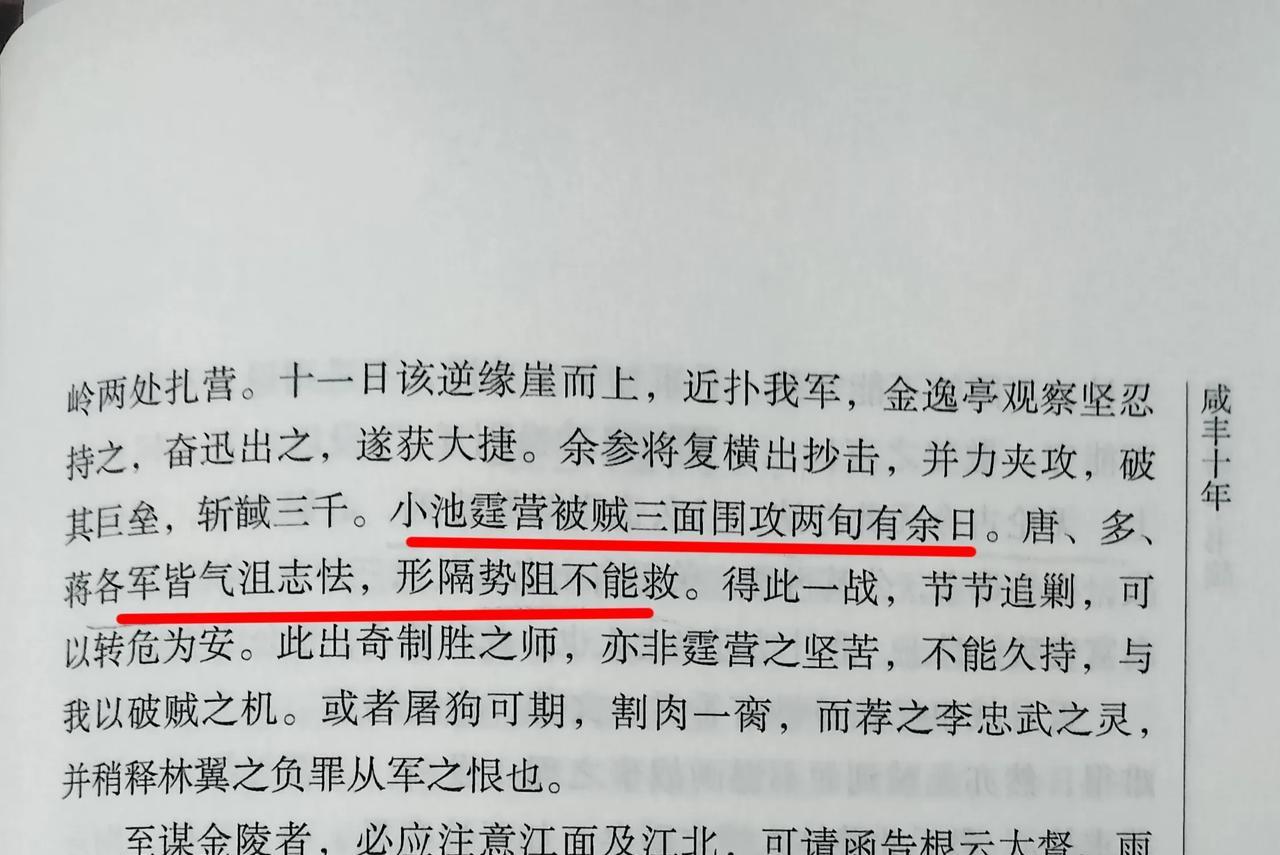 小池驿之战胡林翼曾作了最坏的打算,密嘱鲍超到了万危紧急时刻、保全军队退往新仓或荆桥,有过,则由胡林翼一人承担。 咸丰九年底十年初,陈玉成率太平军六万余人救援安庆,鲍超率霆营三千六百人坚守小池驿四十余天,抵御陈玉成军团。 陈玉成派出三四万太平军包围霆字营,日夜进攻,鲍超率军顽强抵抗。 胡林翼在致多隆阿的信中说,霆营以三千六百人当三四万太平军,太平军日夜攻击,其苦战可危,其愚忠可念。 在致鲍超的信里,胡林翼称赞鲍超孤忠贯日月,义气薄云霄,可感可敬。 在致浙江巡抚罗遵殿的信里,胡林翼说,小池驿霆营已被太平军围攻二十余日,友军皆气沮志怯,形隔势阻不能救。 在最危险的时刻,胡林翼给鲍超寄去密函,密令鲍超,如力实不能支,以保全军旅为主,万一到紧急无可如何之时,则退往新仓或荆桥,有过,自己一人承担,断不会诿过于人。但不可向他人透露。 没想到鲍超霆营意志力之顽强超出想象,鲍超在小池驿坚守了四十三天,让陈玉成数万大军徒唤奈何。 咸丰十年正月二十五日,多隆阿率官军反攻太平军,鲍超率霆军突围而出。陈玉成撤出小池驿。 ——《胡林翼集》