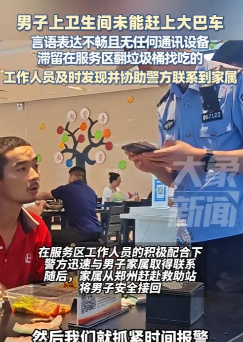 太惨了!河南一位男子坐大巴去苏州打工,结果在服务区上个厕所,竟被司机**“落下”**!身无分文、手机还在车上,他只能在垃圾桶里翻别人丢掉的面包和矿泉水充饥,一度饿得发抖。直到工作人员发现报了警,家人才连夜赶来把他接回家。网友:走之前不该查查人数? 根据大象新闻7月20日的视频,这天凌晨,服务区的保洁刚出门准备丢垃圾,却看到有一位男子,正弯腰在大垃圾桶里翻找着什么。 保洁仔细查看,发现是一副生面孔,就上前询问对方发生什么事了。 男子明显被吓了一跳,啊啊的也说不出一句完整的话,保洁立即明白过来,他可能语言有点障碍,于是就耐心的引导男子来到自己工作的餐厅。 餐厅里的员工也迎了上来,保洁说自己刚才扔垃圾的时候看到他了,我也听不清他说的什么,但是看着很饿,咱们要不然给他弄点吃的吧。 员工看着男子唯唯诺诺,满脸疲惫的样子,一心软也答应了,经过慢慢的沟通,男子表示自己是跟着大巴车来的,准备去打工。 在路过服务区的时候,自己就下来上了趟厕所,所有的东西都没带,等他出来的时候,大巴车已经没了踪影。 说着就从身上掏出一张身份证和一张车票,工作人员也报了警,警察很快赶到,通过身份证和车票,在工作人员积极配合下,找到了男子的家属,安全把男子接了回去。 事情一出,网友纷纷表示,这种司机太不负责任了,哪怕随手清点一下也不会出这种事。 也有网友表示,出门在外太难了,打工人都不容易,饿到翻垃圾桶,想想就心酸。 对于这件事,大家有什么想说的呢?欢迎在下方分享!