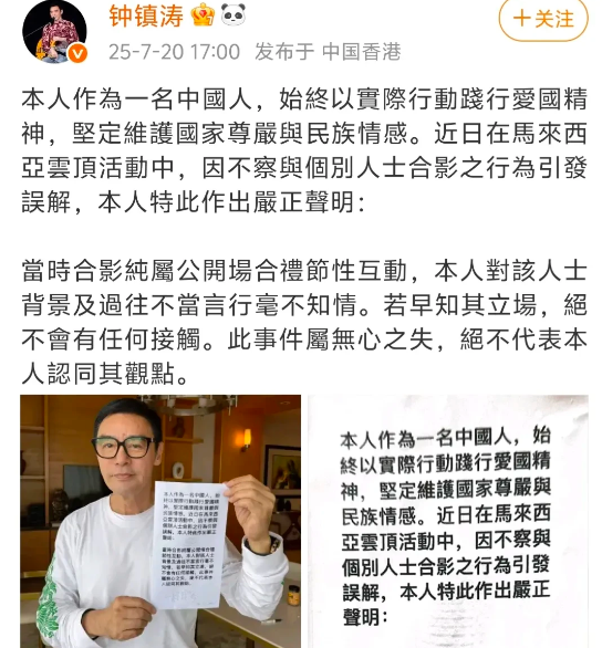 据悉是因为近期曾志伟和钟镇涛和一个马来西亚对华不友好的艺人合影。众所周知这种情况高度敏感,所以曾志伟和钟镇涛也有意识到事情的严重性,紧急发文澄清,表达自己的立场。