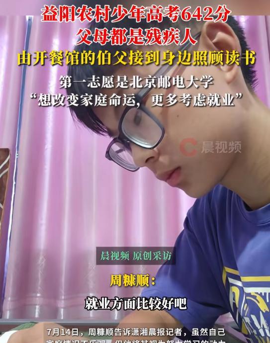 “来不及了,我不上985了!”湖南益阳,18岁高考考生考了物理类642分,超湖南一本线近200分,谁料,填报志愿时,他却放弃985选择北邮计算机专业,网友了解到他家里的情况后,感叹:寒门贵子呀! 湖南益阳的夏天,18岁的周糠顺正在伯父的早餐店里擦桌子,手机屏幕突然亮起的高考分数让这个总是安静的少年愣了一下。 642分,物理类,超过当地一本线近200分。 这样的分数,往年足够叩开中流985高校的大门,但在填报志愿时,他却在志愿表上郑重填上了北京邮电大学计算机专业,第二个志愿是西部的一所211高校。 这个选择在网上引起了不少讨论。 有人觉得可惜,说这样的分数去复旦、交大多好,北邮虽然计算机专业强,但平台和985比还是有差距。 也有人说他短视,为了早点挣钱连名校光环都不要了。 但很少有人知道,这个决定背后藏着一个家庭沉甸甸的重量。 周糠顺的家在农村,日子过得很紧巴。 父亲早年打工时摔断了腿,走路一瘸一拐,靠着在村里做保洁挣点生活费,母亲常年生病,药罐子从没离过手,一年光医药费就得好几万。 家里最像样的家具,只有一台用了很多年的旧电视机。 十年前,8岁的周糠顺在学校被撞断了肠,十万块的手术费像座大山压得这个家喘不过气。 是村里的老校长写了封求助信,社会上的好心人你一百我五十地凑钱,才把他从鬼门关拉了回来。 父亲当时把每个捐款人的名字和金额都一笔一划抄在本子上,告诉儿子要记住这些恩,将来有机会一定要还。 从那以后,周糠顺就比同龄孩子懂事很多。 初中开始,他就寄住在伯父家。伯父开了家早餐店,每天凌晨四点就得起来揉面、炸油条,挣的钱要同时顾着两个家。 伯父不管刮风下雨都送他上学,伯母帮他洗衣做饭,堂姐还经常给他讲题。 他知道伯父伯母不容易,教辅书都是借同学的,补习班一次没去过,就怕多花家里一分钱。 高中三年,为了省车费和时间,他一直住校,连春节都留在空荡荡的宿舍里刷题。 成绩常年在年级前十,查分那天看到642分的结果,他也只是淡淡说了句“跟模考差不多”。 填报志愿时,亲戚们都劝他报985的计算机或人工智能专业,说这些学校名气大、平台好。 但周糠顺心里有本更实在的账:北邮计算机专业就业率高,毕业生进大厂的平均时间比很多985高校要短一年,起薪也稳定。 他算过,父母一年的医药费,差不多是伯父早餐店八个月的净利润,也是他如果去普通学校勤工俭学收入的三倍。 对他来说,父母的药不能停,家里等不起他读完985再慢慢找工作。 后来有好心人听说了他的情况,想给他捐钱,累计超过十万块,但都被他婉拒了。 他说应该把钱给更需要的人,自己能打工挣钱。 如今,他申请了助学贷款,教育局说学费不用愁,这个暑假他还接了四份家教,打算靠自己挣生活费。 周糠顺的故事,让我们看到了寒门贵子最动人的模样。 他们生长在并不富裕的环境里,却没有被生活的重压击垮,反而早早学会了体谅家人、铭记恩情。 周糠顺放弃985的光环选择尽快承担家庭责任,这样的选择背后,是超越年龄的成熟和担当。 在物质条件相对匮乏的环境里,他们没有抱怨,而是用努力改变现状。 面对诱惑和选择时,他们把家人和恩情放在首位,这样的清醒和坚守,比任何名校光环都更有力量。 寒门贵子的可贵,从来不是单纯的高分,而是在困境中依然挺直的脊梁,是在现实面前始终不忘责任的初心。 他们用自己的方式证明,真正的成长,从来不只看飞得有多高,更要看能不能为家人遮风挡雨,能不能对生活的善意有所回应。