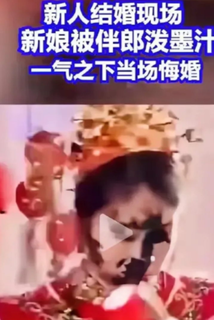 红色衣襟顿时出现几块醒目的黑色印迹,脸上的妆容也被墨汁冲得模糊,新娘当场愣住,紧接着便是整个人歇斯底里的大哭。