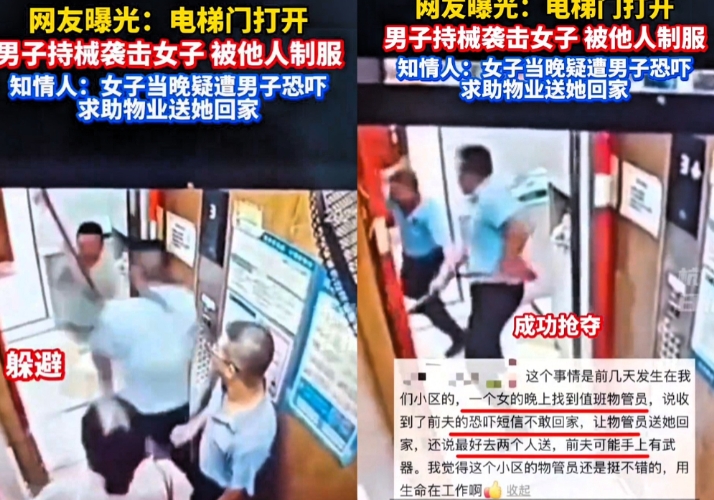 太惊险了!江苏南京,一女子担心被报复,特地请求物业两人护送回家,谁知电梯门一开,一把斧头竟“呼”地砸了过来!那一瞬间,她甚至来不及尖叫。还好物业小哥反应神速,一个飞扑锁喉将歹徒死死按住——而此人,正是她那个家暴又出轨、被判净身出户的前夫。网友:这物业费交的值! 7月20日杭州网的报道,没想到电梯门打开的一瞬间,竟然会是一把斧头呼啸而至,让电梯里的女子和两名物业的安保人员惊慌失措,两名物业保安人员,连忙上前抢夺成功男子手里的斧头,成功的将其制服在地! 原来这名男子和这个女子是相互认识的二人,俩人曾经还是美好的夫妻二人,但是经过长时间的相处,他们二人的婚姻越来越不顺,俩人的婚姻也宣告了失败,走向了离婚! 然而离婚之后的女子并没有得到她想要的自由,因为自从离婚之后,她一直在遭到前夫的骚扰,并且不断的发送手机短信等消息恐吓他,对此女子感到十分的害怕! 其实他们二人选择离婚完全是因为男子的缘故,因为在他们结婚期间,女子经常遭到男子家暴,因为男子又特别严重暴力倾向,对与前夫所发送的恐吓短信,女子感到十分的害怕,因为她的前夫知晓她所居住的地方,并且前夫声明自己在她的家门口蹲守! 站在小区门外的她迟迟的不敢返回家中,眼见天色已晚,害怕至极的女子选择了前往小区物业的办公室,告诉了自己的担忧,想让物业保护她返回家中,对此物业的管理人员,安排了两名物业保安前去进行护送! 于是就在小区电梯门打开的一瞬间,女子的前夫抡起了他手中的斧头,朝着刚刚打开门的电梯挥去,幸好物业的两名安保人员反应迅速,躲开了这致命的一击,俩人心领神会的上前将男子手中的斧头抢夺,并且将其制服在地! 这件事情很快被曝光在了网上,视频一经发布,在网上迅速地,引起了众多网友的热议: 有的网友称道:“给这两个物业公司的小伙子见义勇为奖,已经超出了物业的职责,直接变身保镖了,这是救命!与持刀歹徒搏斗,保护人民,这就是见义勇为。” 还有的网友说道:“这个男的对离婚可能一直在想很冤,可能这个女的在婚姻存续期间也有过错,所谓的家暴为什么产生,原因有多方面,清官难断家务事,处理不好,容易留下后遗症。男的受惩是必然的,但治得了人,能否治得了心就难说了!” 那么,对于这件事,大家有什么看法? 信源:杭州日报