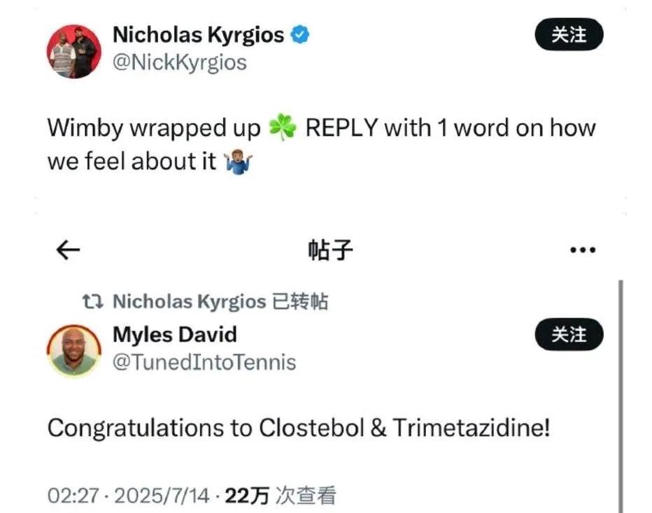 毫不客气,克耶高斯:用一句话总结本赛季的温网,恭喜氯司替勃和曲美他嗪。 温网已经结束,两位曾经因“药检”问题的球员辛纳和斯瓦泰克分别获得男子和女子冠军引起很大的争议,前澳大利亚网球名将克耶高斯一直是兴奋剂的反对者,他在社交媒体上说到:温网已经结束,如果用一句话总结我对本届温网的感受的话就是:然后他转发了著名网球评论员Myles的发文“恭喜氯司替勃和曲美他嗪”。 新科温网男单冠军辛纳曾因“误服氯司替勃”被禁赛3个月,而新科温网女单冠军斯瓦泰克则曾因“误服曲美他嗪”背禁赛1个月。