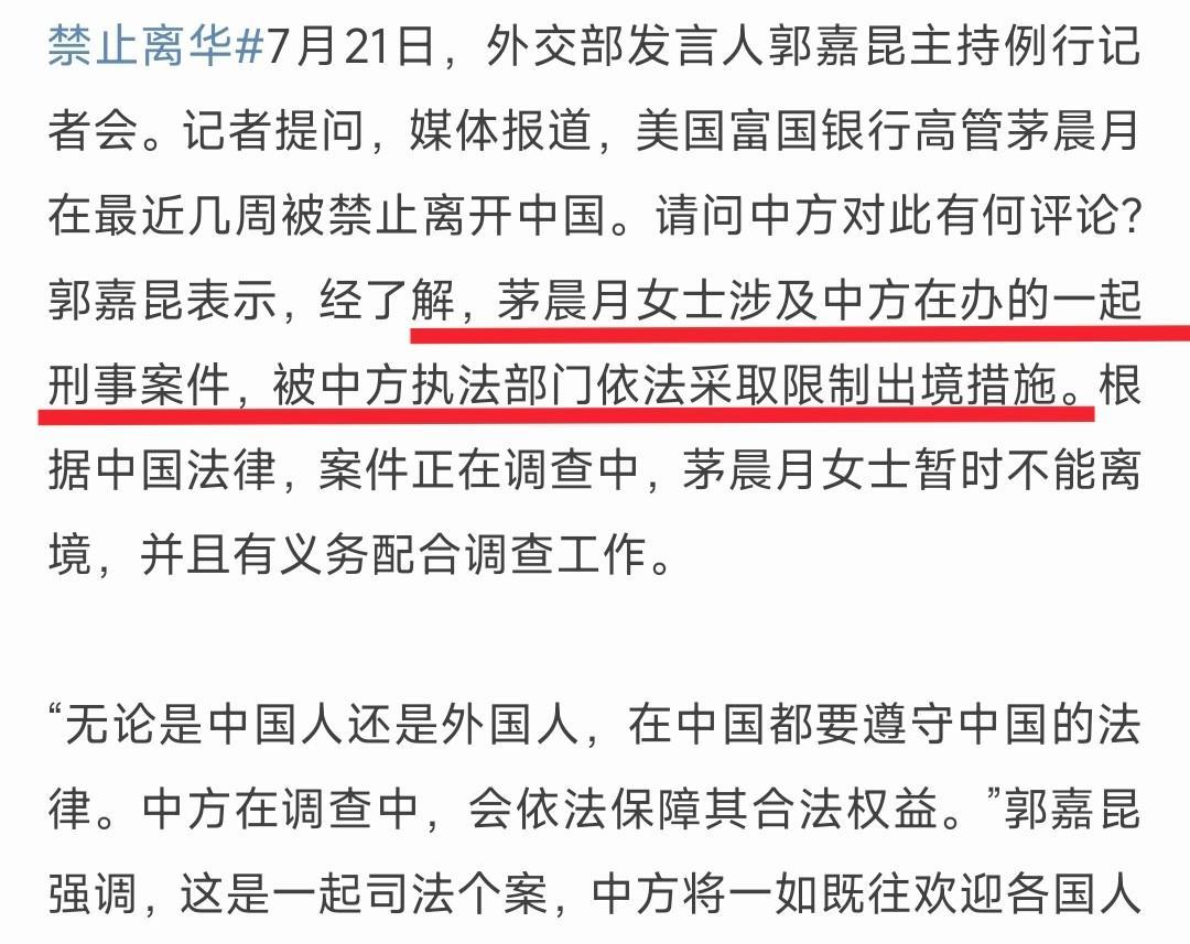 一名在华美企高官被限制离境,外交部回应了:涉刑事案件 近日,多家美媒报道称,美国富国银行的女性华裔高管茅晨月,在近期回国探亲后被限制离境。21日,外交部发言人郭嘉昆确认,其涉及了一起正在侦办的刑事案件,中方因此依法限制其离境,同时她本人也有义务配合调查。 此外,有美媒称,富国银行已暂停所有赴华的公务差旅。