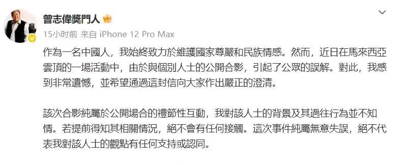 曾志伟不会再有下次了吧!上次是受朋友邀请给朋友的朋友庆生,这次是不知道马来西亚反华歌手以前的言行,只是礼节性合影,中国有句古话叫做再一再二不再三,一次二次你都说不知情,那就不会再有下次了吧,如果有第三次那再多的借口再深刻的道歉也说不过去了吧!