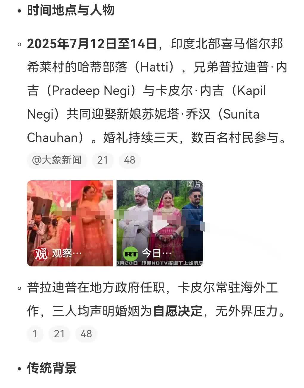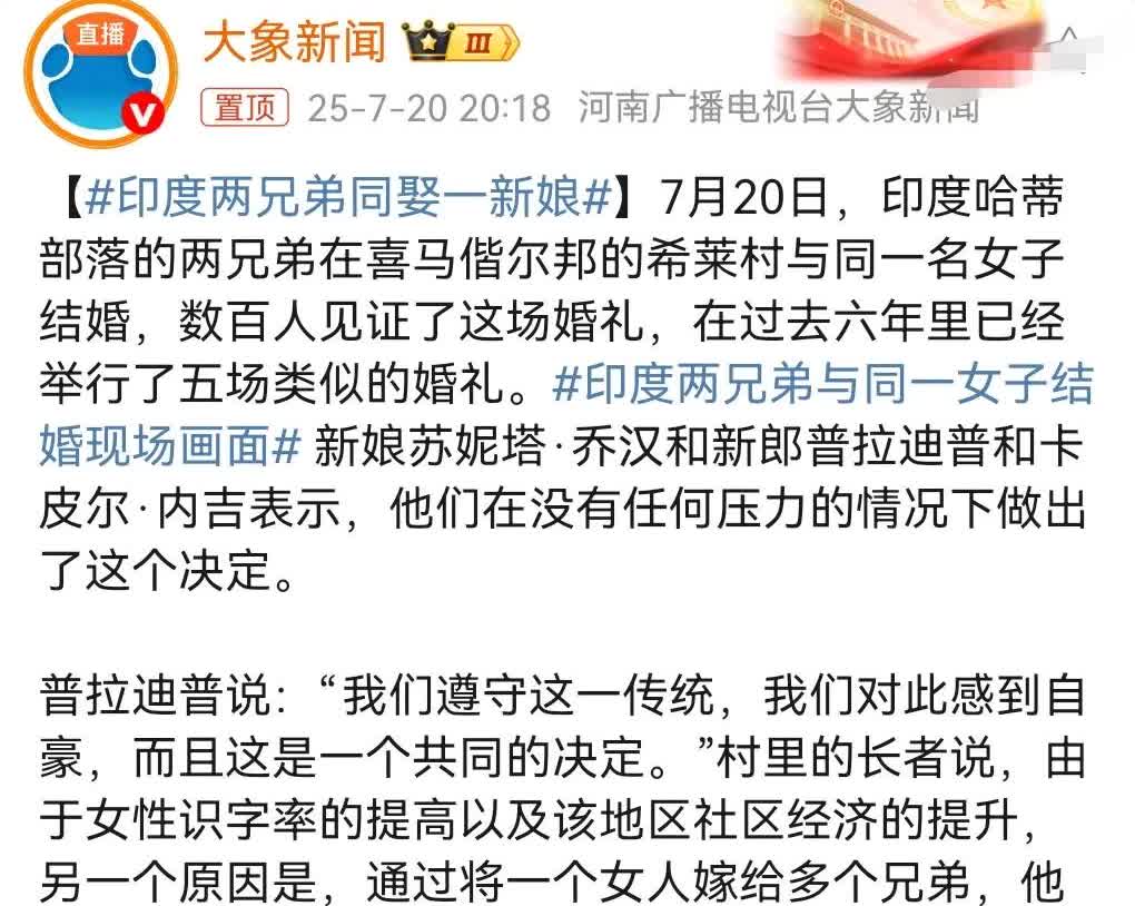 太离谱了。 印度果然是一个奇葩的国度。 7月20日,印度两兄弟同娶一新娘。 这也太和谐了吧,难道不怕争锋吃醋吗? 据说这是当地的传统,并且获得政府认可。 当事人并以此感到自豪。 这真的是厉害了。 据说是为了巩固财产,避免在继承人之间分割。 还能说什么了,连爱情都能共享,离谱到家。