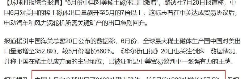 中国也学会西方“整人”的办法了,特朗普100亿美金要泡汤了 太突然了,中国对美稀土出口量激增660%,特朗普砸下的100亿美金要血本无归了。 我国限制稀土出口之后,美国军工快要喘不过气了,特朗普急的直跺脚,在和中国贸易谈判的同时,要求中国尽快恢复稀土供应。 特朗普誓要摆脱中国控制,从收购乌克兰矿开始,连续出手东南亚,拉美以及澳洲达成稀土矿产合作。 特朗普不惜血本,甚至砸下百亿美元也要自己单干。 前几天,特朗普甚至迷恋上美国以前根本看不上眼的一些非洲国家,比如加蓬、几内亚等非洲小国。原来特朗普看中了这些国家的矿产资源,稀土战略才是特朗普的目的。 但是,正在特朗普雄心勃勃拿巨资准备大干的时候,中国突然加大对美稀土出口。 据相关最新数据显示,在整个6月之中我国对美稀土出口量一度激增660%,累计达352.8吨稀土产品源源不断的出口至美国。 这和西方人整中国的手法何其相似,特朗普放开芯片对中国的管制,就是要阻止中国在芯片领域独立自主发展的能力, 当你没有的时候,高价也不想卖给你,当你投入大笔资金准备大干的时候,降价也要卖给你。 不过,这一次中国不会再上当了,现在反过来该让美西方国家尝尝我们中国“稀土制裁”的滋味了。