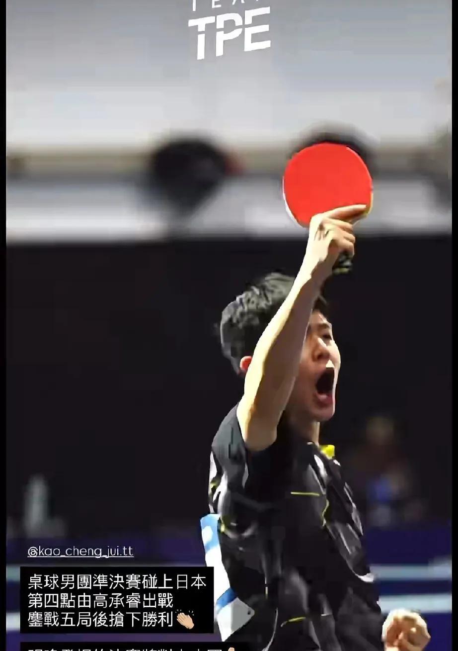 喜欢高承睿身上的血性 大运会半决赛, 中国台北3-2战胜日本, 小高一人为台湾队赢得2分, 小高的狠劲和不服输的样儿, 很像幼头时的王楚钦, 特别是第四盘苦战五局, 为团队拿下第三分, 赢下比赛举拳呐喊, 太有激情和血性, 也是继台林之后, 台北队又一未来之星, 加油小高!未来可期!