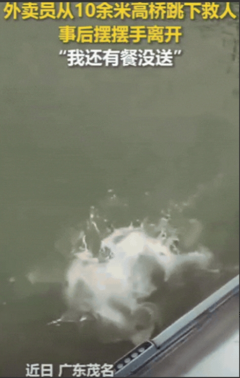 “上人民日报了!”广东茂名,50岁外卖员送餐经过大桥,突然跳下车,从10余米高桥跳下,迅速向水中间游去,原来是有人不慎落水,他将落水者救起之后,有人让他留下姓名和电话,可他却摆摆手离开:我还有餐没送。网友:湿漉漉的背影令人动容,为你点赞! 据人民日报7月21日报道,50多岁的外卖员老陈(化名)平时生活工作中就是一个非常善良朴实的人,他为了贴补家用,每天在外面跑外卖讨生活。 事发当天,外卖员老陈和平常一样,安安稳稳的骑着车,去指定的地方取餐品,然后马不停蹄的去送,在路上车筐里的餐盒随着骑行轻轻摇晃。他专注地盯着导航,盘算着送餐路线,心里想着别让顾客等太久。 可谁也没想到,一场惊心动魄的救援,即将在这座 10 余米高的桥上发生。 当老陈骑着车,路过一个桥面的时候,桥面上车来车往,老陈的电动车刚行驶到桥中间,他眼角的余光突然瞥见桥边有异样,几个人围着桥边,向下看着,脸上全是担忧和紧张。 老陈几乎是条件反射般,他猛地刹住车,想看发生了什么,老陈把电动车往路边一推,两步就冲到桥边护栏处。结果从别人口中得知,有人落水了!老陈听到这一消息,心里先是一惊,然后立马顾不上反应,他心里只想着赶紧救人! 于是他衣服都没脱,他双手抓住护栏,纵身一跃,直接从十米高的桥上,直直的跳了下来。此时,桥下的水面上,一个身影正在挣扎,汹涌的江水根本让那人没有力气反驳。 老陈入水的瞬间,冰凉的水瞬间浸透他的衣裳,可他顾不上这些,迅速调整身体,朝着水中间拼命游去。落水者在水里拼命扑腾,力气正一点点被水流抽走。老陈游到跟前,一把抓住对方的胳膊,使劲往岸边拖。 他年纪不算小,加上从高桥跳下耗费了不少体力,每游一下都要憋着劲,可救人的信念撑着他,动作一刻没停。周围渐渐有人发现了这边的动静,桥上的车主纷纷停车,有人拿出手机报警,可老陈没空抬头,只顾着拖着落水者往岸边靠。 好不容易到了浅水区,老陈拖着浑身湿透的身子,和落水者一起上了岸。此时,落水者已经缓过些神,意识到是被人救了,嘴里嘟囔着感谢,可老陈没多停留。他想起车筐里还有没送的餐,顾客说不定正等着,于是朝着围观的人摆了摆手,转身就往电动车方向走。 有人喊住他,想留下他的姓名和电话,好让被救者家人感谢,可老陈只是摆了摆手,声音带着点喘的说,他还有餐没送,不用了。 说完,骑上车,消失在车流里,只留下他湿漉漉的背影。 这场救援,被桥上的路人用手机记录了下来,视频很快在网上传开。网友们刷到视频时,纷纷被老陈的举动打动。有人评论说:“普通人的勇敢最动人,他跳水的那一刻,根本没想自己危险,满脑子都是救人,救完人连功劳都不想要,转身就去送餐,这才是真正的英雄!” 还有人感慨:“生活里的英雄,往往就是这样默默出现,又默默离开,他的背影虽然湿漉漉的,却让我们看到了最耀眼的光。” 对于这件事,大家有什么想说的呢?欢迎在评论区分享。