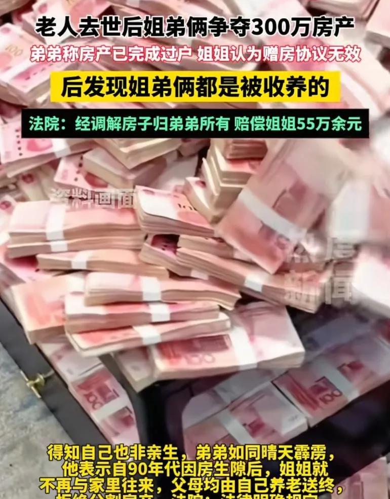 老人去世后姐弟俩争夺300万房产,弟弟称房产已经过户,姐姐认为赠房协议无效 随后发现姐弟俩都是被老人收养的,经过法院调解,房子归弟弟所有,给姐姐55万。这姐姐心思很深啊,早就知道弟弟不是亲生的,父母在的时候不告诉他,跟家里不再来往,弟弟以为自己是亲生的,心甘情愿给父母养老送终。等父母走了,要分割财产,跑出来说明弟弟也非亲生,不但给弟弟闷头一棍,还名正言顺站在和弟弟同一立场上平分财产。这是做了很充足的准备啊! 姐姐就是仗着姐姐这份关系回来问弟弟要家产的,姐姐也是一个狠人从1990年就断绝与家里的往来到现在202几年了知道养父母死了就回来问弟弟要家产,钱真是一把双刃剑,姐弟关系彻底成为陌生人的终结者 个人觉得养父母都是弟弟养老送终,这个遗产就应该归弟弟。养父母把你养大就不错了,而且养老送终还是弟弟干的