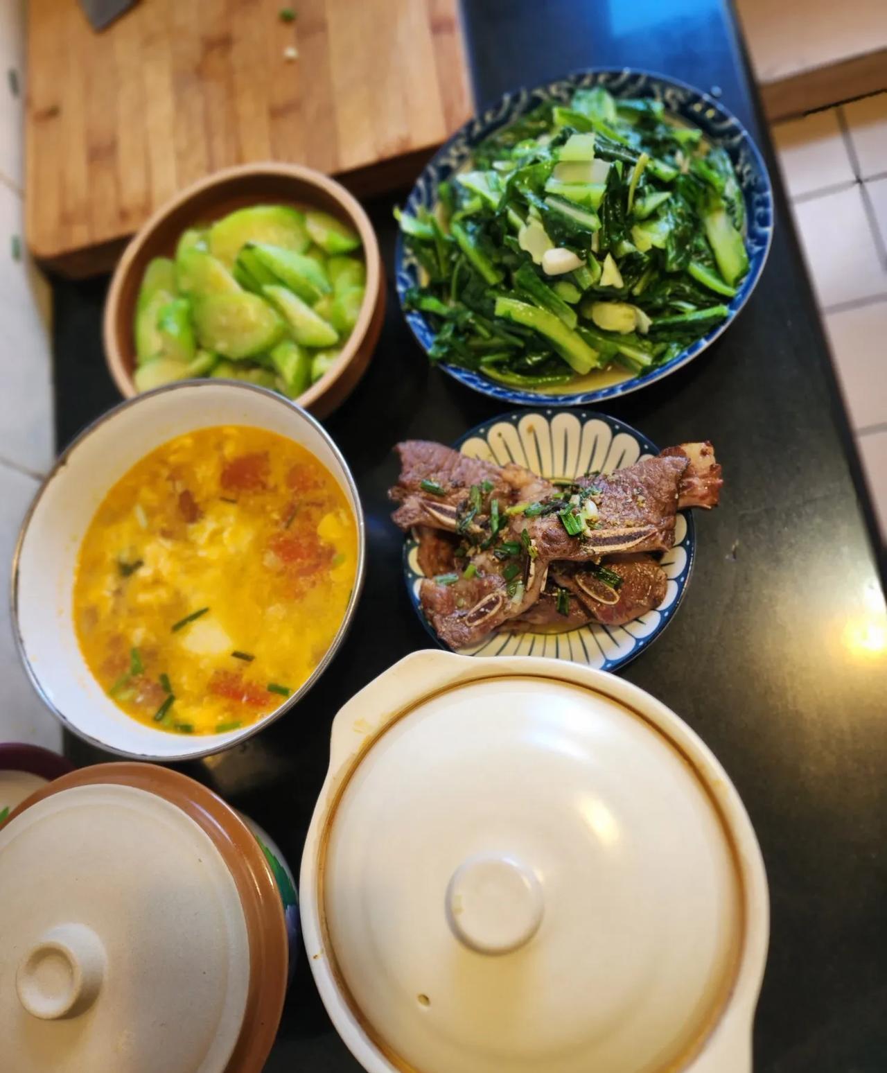 祝氏今日菜谱红烧大红鸡,煎牛排,清炒丝瓜,爆炒油麦菜,西红柿炒鸡蛋,珍珠元子。