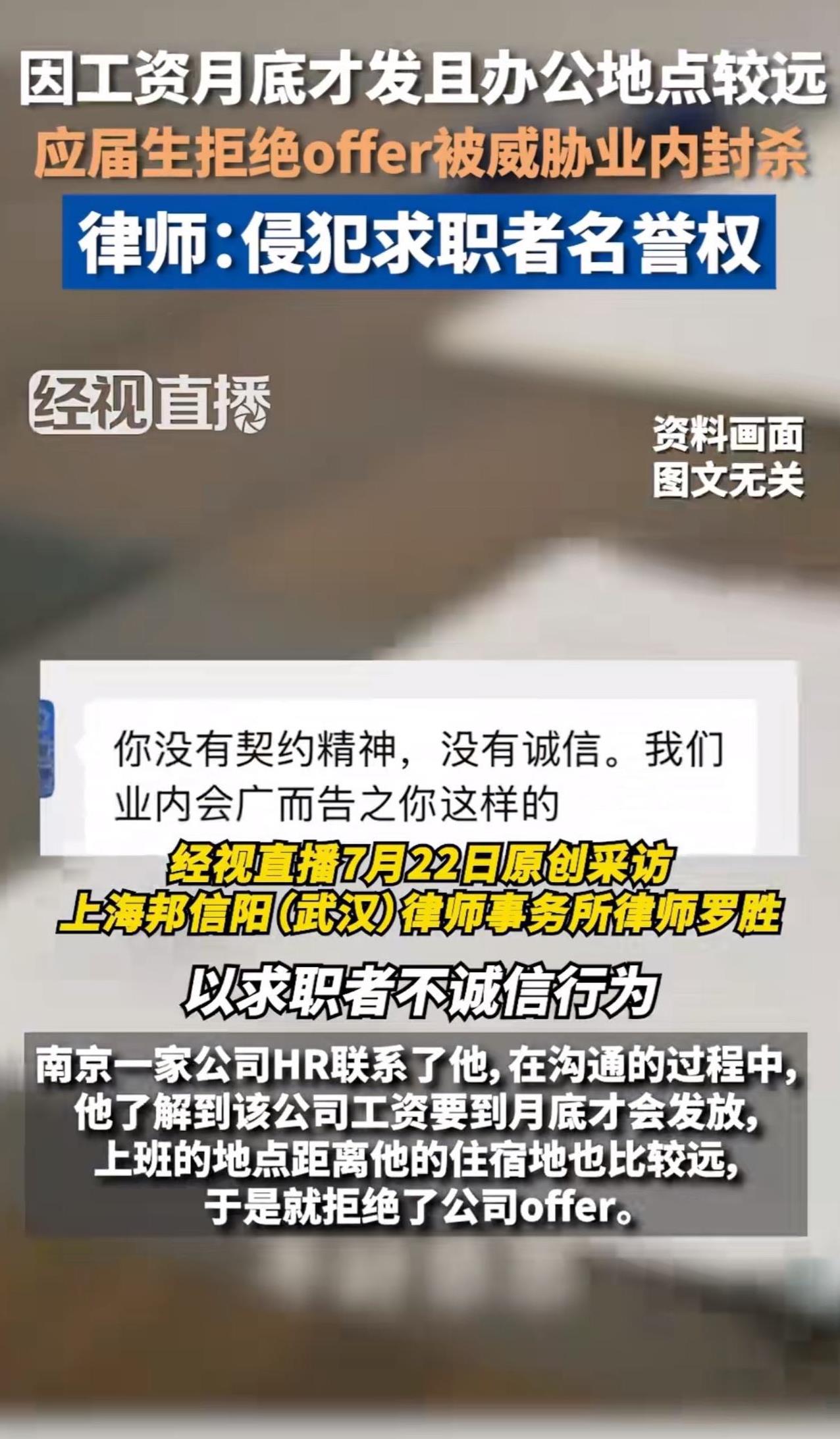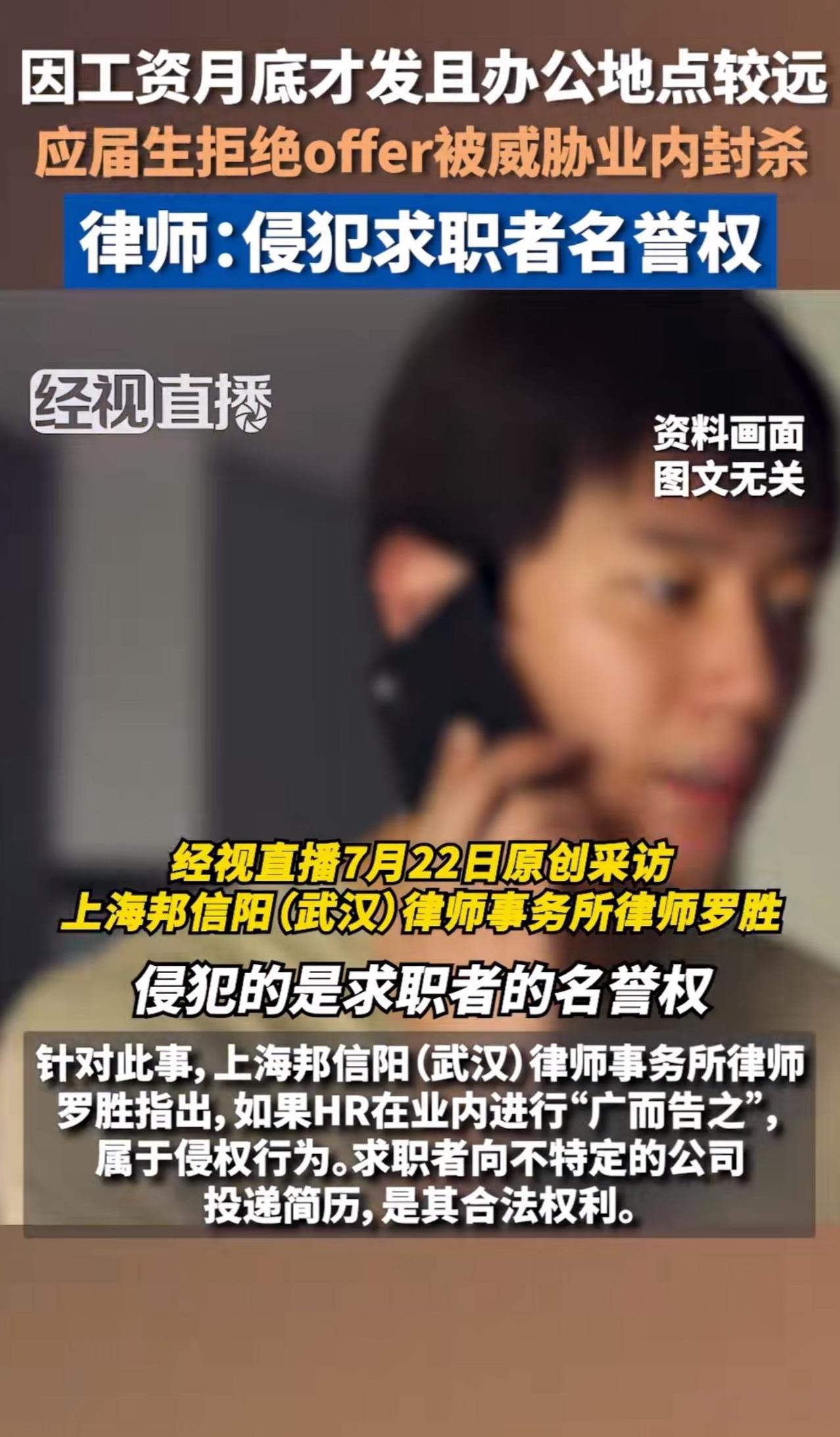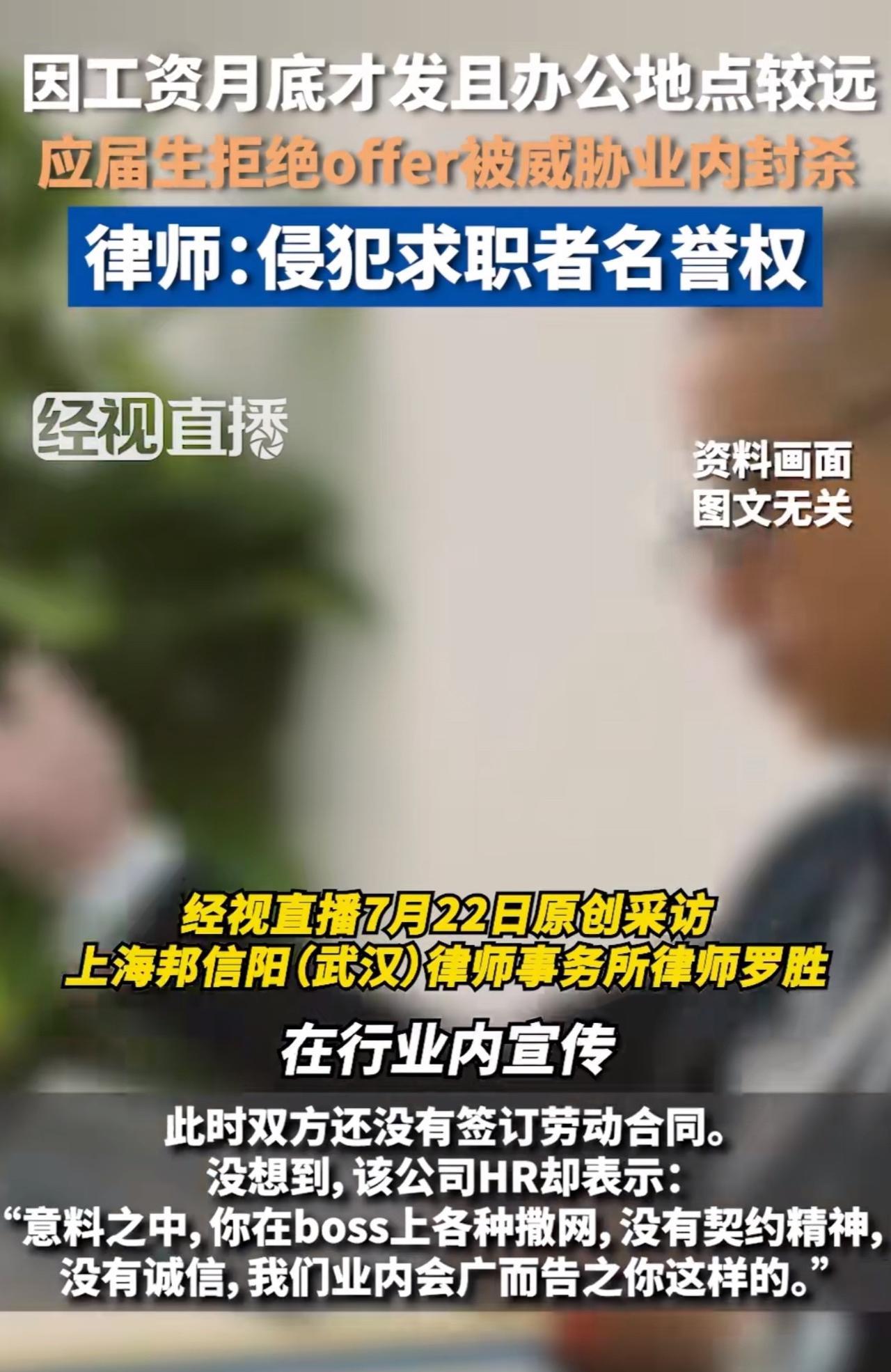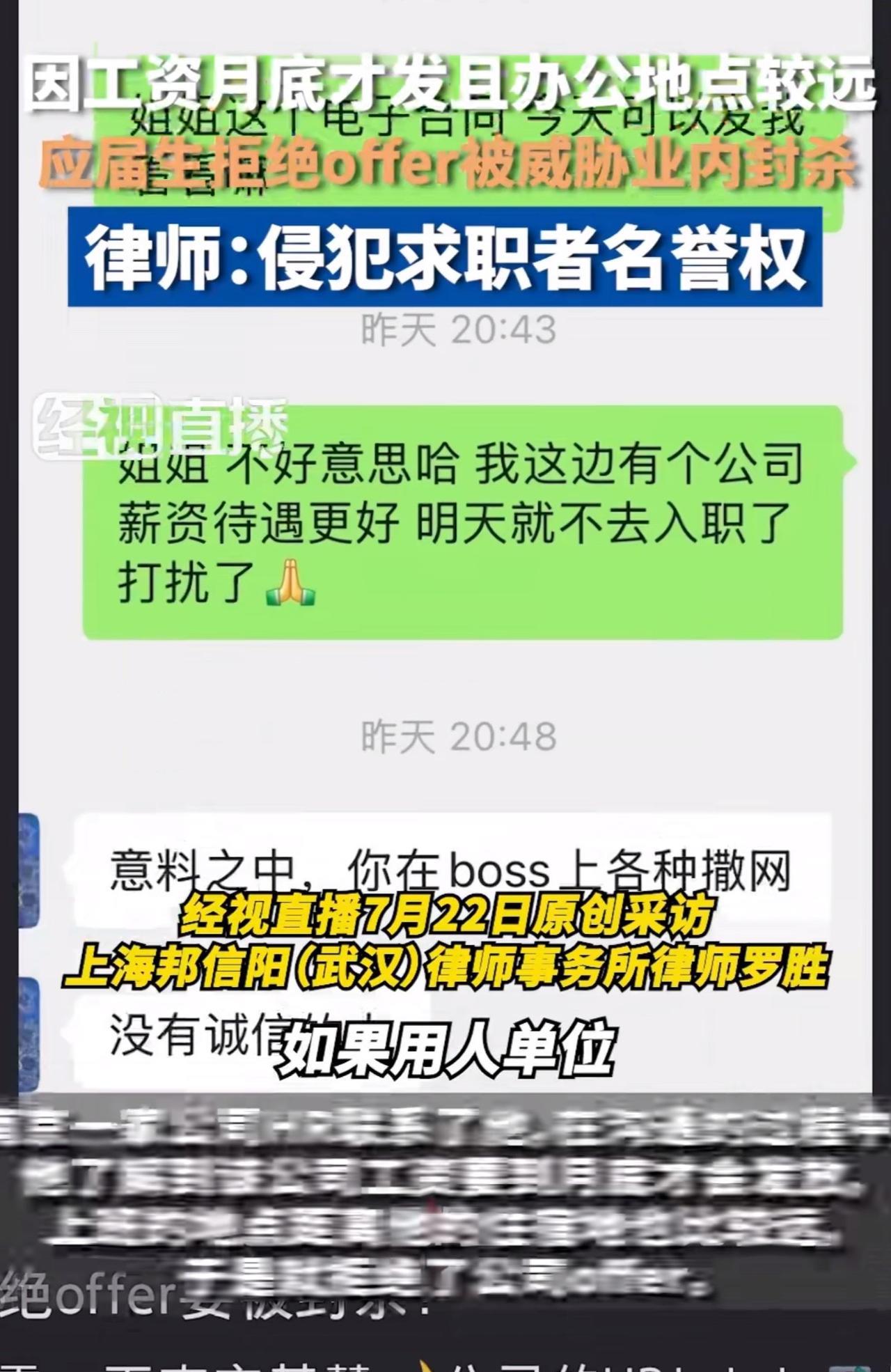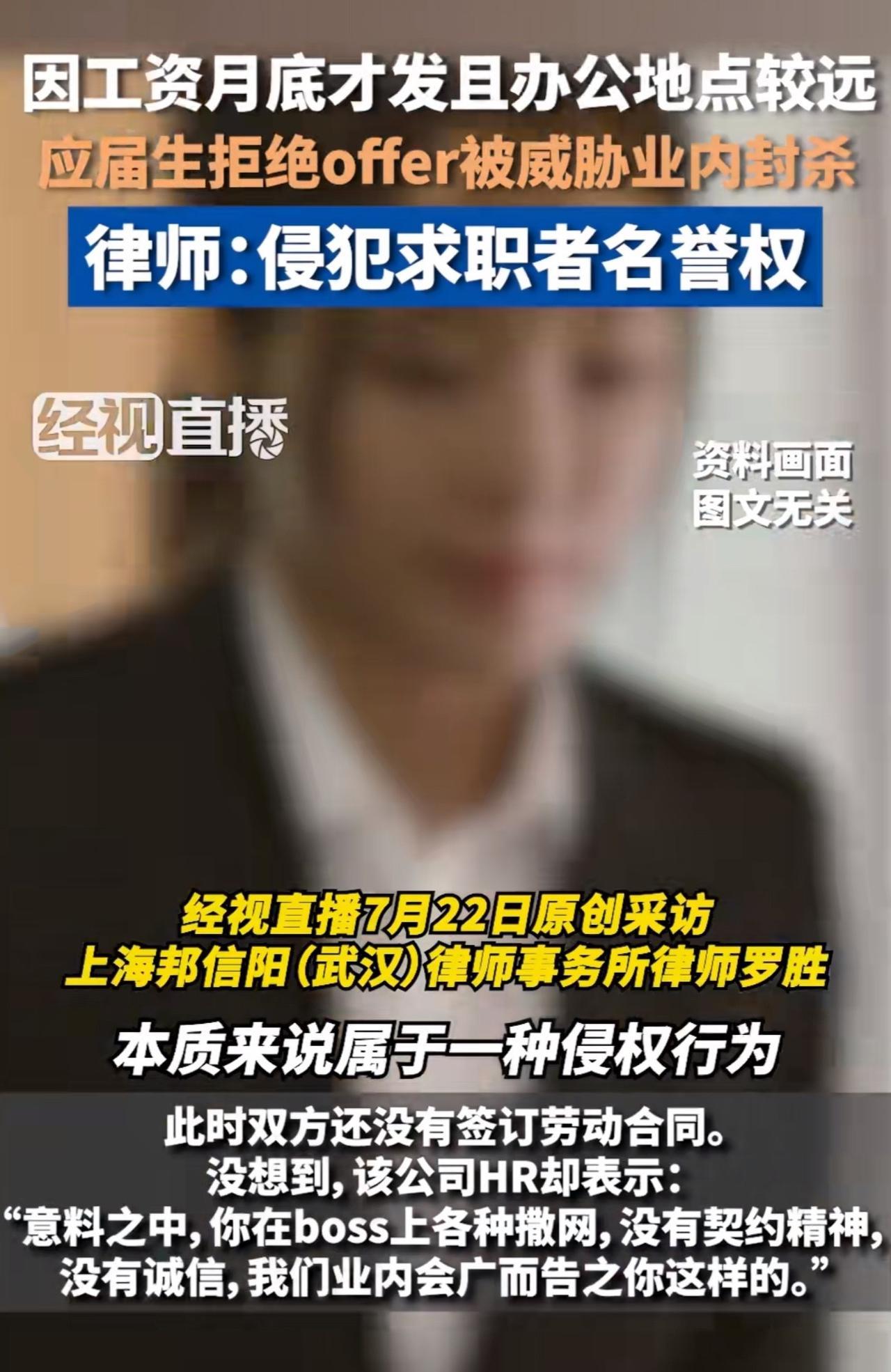 面对这家公司HR这番话,不少网友纷纷反驳道,“不是还没签约吗?要什么契约精神!” 针对此事,律师指出,“在没有签订合同的时候,如果用人单位以求职者不诚信行为在业内宣传,属于侵犯求职者的名誉权!” 周少想说找工作本就是双向选择,这毕业生还没签合同,拒绝offer再正常不过。 可这家公司HR,只因被拒就给人扣“没契约精神、没诚信”的帽子,还威胁业内“广而告之”,实在太过分!这不仅是滥用话语权,更是对求职者权益的侵犯。 一些公司总觉得自己高高在上,求职者就得无条件接受offer ,不然就是“大逆不道”。周少想说这种观念该改改了,谁给你的权利啊!求职者有选择的权利,企业也得反思自身留不住人的原因,而不是搞这种“封杀”威胁。 如果真要这么干,那不好意思,就像律师所言,作为求职者肯定要坚决维权,维护自己的名誉权。要不然,这真是无法无天了。 要是你遇到这种事,会怎么处理呢?#长沙新朋友# #寻美三湘#
