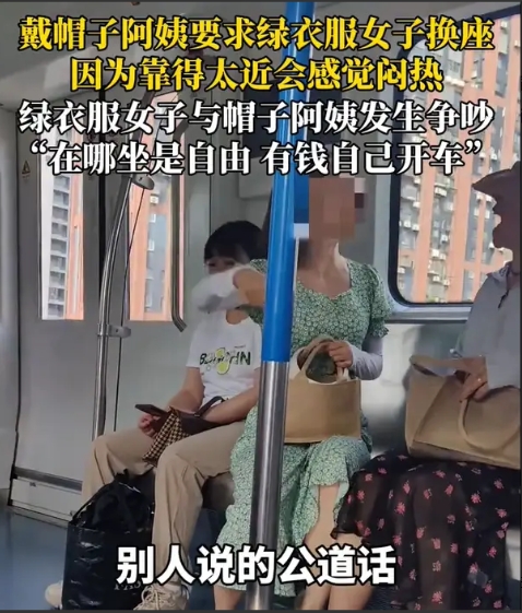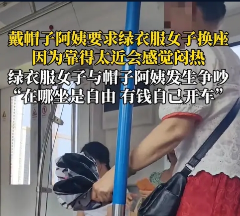 武汉,在地铁上,一位戴帽子的阿姨,看到一位绿裙子阿姨入座之后,非要她换个座位,说坐在这里自己很闷,一点不舒服。绿裙子阿姨说,自己花钱坐地铁想坐哪里坐哪里,两人产生了争执。