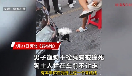信息来源:《男子遛狗,狗被撞死,直接拦车不让走,交警:一没狗证,二没牵绳,狗主人负全责!》观象视频