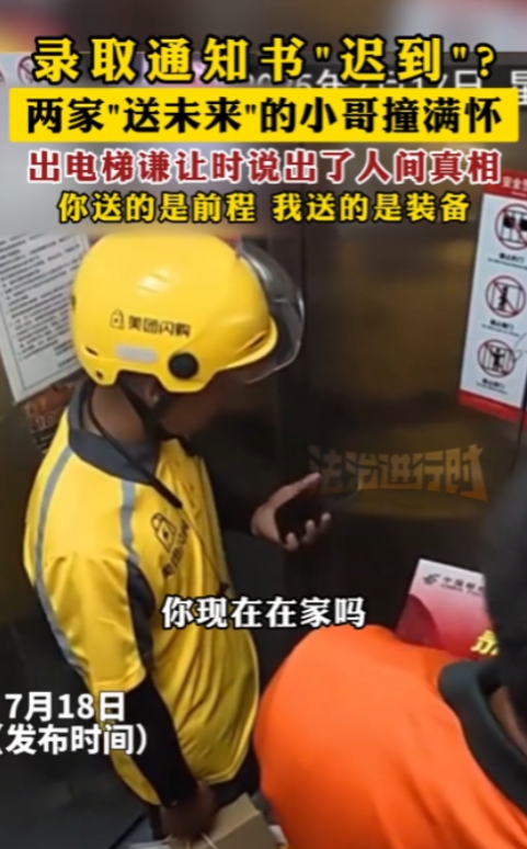 信息来源:《录取通知书"迟到"? 两家"送未来"的小哥撞满怀 出电梯谦让时说出了人间真相 你送的是前程 我送的是装备》法治进行时