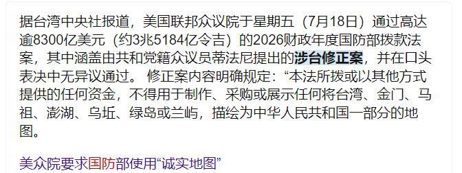 美众议院禁止将台澎金马纳入中国地图,或动摇中美关系根基。 7月18日,美国联邦众议院通过国防部拨款法案,其中就包括共和党籍众议员,蒂法尼提出的涉台修正案,不许用拨款法案下发的任何资金,制作、采购、展示包含台澎金马地区的中国地图。 这种用行政手段篡改地理事实的做法,简直是滑天下之大稽。 地理不是政治筹码,领土归属更不是政客们可以随意摆弄的工具,台澎金马从来都是中国领土不可分割的一部分,这是国际社会公认的事实。 从1971年联合国恢复中华人民共和国合法席位,到中美三个联合公报明确的一个中国原则,再到全球182个与中国建交的国家共同承认的事实,哪一条不是铁证? 这些议员难道不清楚,这种做法会把中美关系逼到何等危险的境地?中美关系的政治基础是一个中国原则,是承认台湾是中国领土的一部分。 现在他们非要在地图上做文章,说白了就是在挑战中国的核心利益,在触碰中国人民的底线。 远的不说,2021 年参议院就搞过类似的对台法案,最后被拜登以 “可能引发地区动荡” 为由否了。 现在众议院又来这套,无非是国会山那帮人眼看中期选举要到了,想靠打 “台湾牌” 讨好右翼选民。 那些议员以为靠一个修正案就能改变事实?简直是痴心妄想。再看美国内部,这事儿早就吵翻了天。 五角大楼匿名官员跟《防务新闻》抱怨,说这修正案 “纯属瞎折腾”,作战地图要是标错了,导弹发射的坐标、战机的飞行路线都可能出问题,真发生冲突就是人命关天的事。 再看看五角大楼的处境,一群军人要被迫使用错误的地图指挥作战、开展演训,这不仅会让美军的专业性荡然无存,更可能在实际操作中造成无法预估的混乱。 战场上的地图差之毫厘,后果可能就是谬以千里,这些政客为了自己的政治前途,根本不管军方的实际需求,这种将政治凌驾于专业之上的做法,只会让美国的军事决策系统蒙羞。 说到底,众议院这步棋走得既蠢又险。他们以为改改地图就能给中国添堵,却忘了台湾作为中国领土一部分,是写在联合国宪章和无数国际条约里的铁事实。