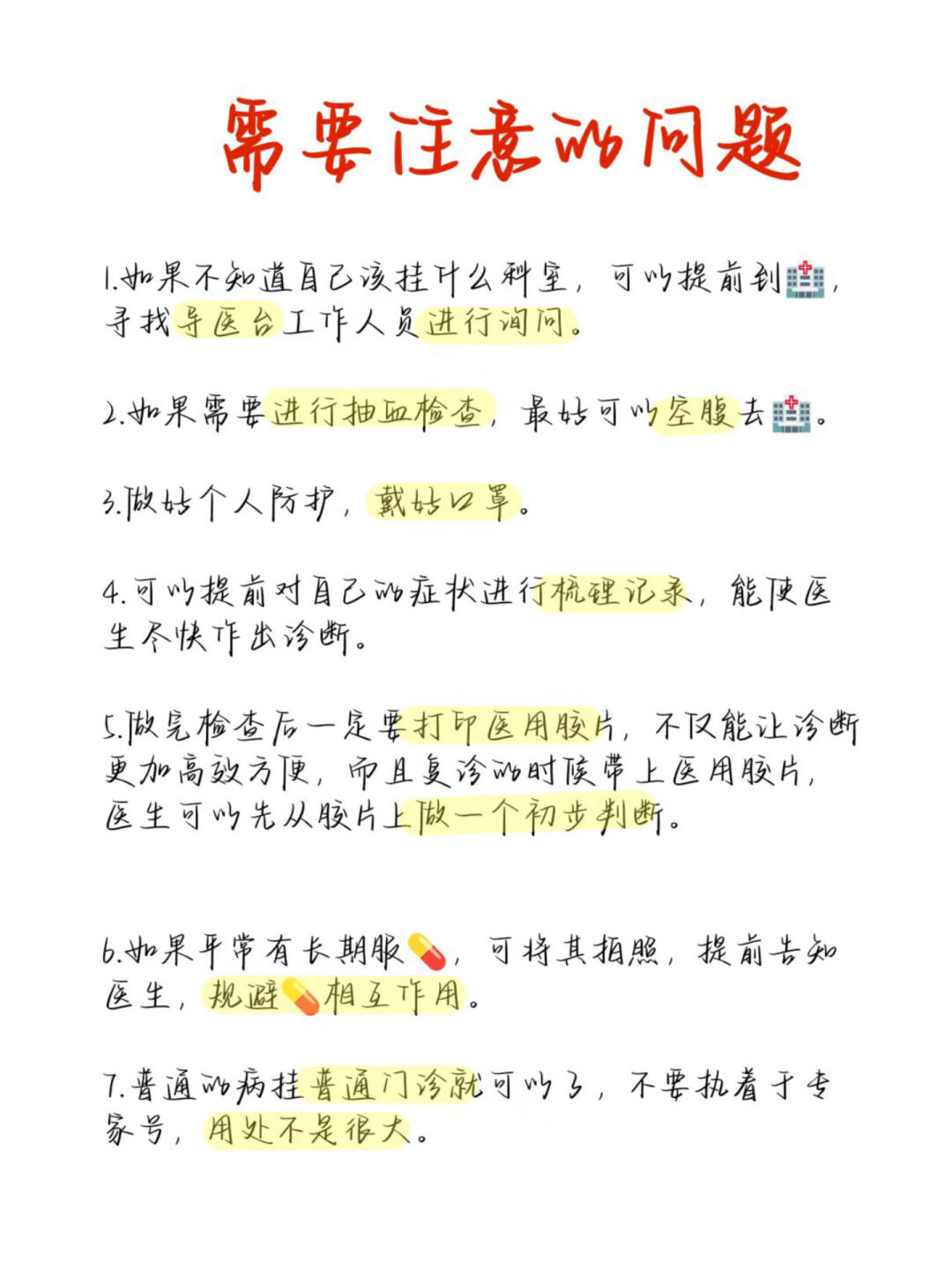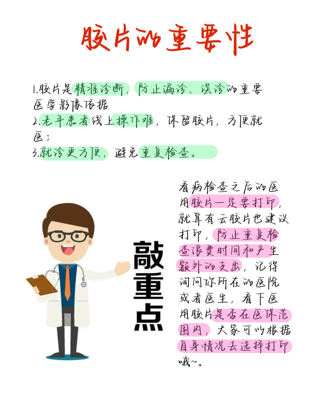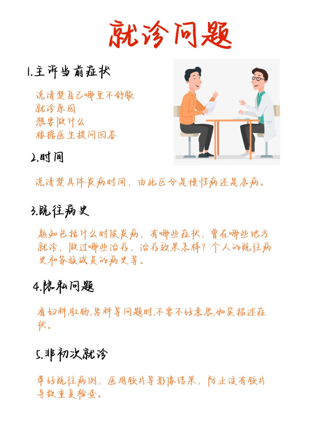 医学生笔记——🏥就诊攻略 🙋♂我是blue,主业学医,副业画画 🎨用图画形式学习医学知识——今天学习“🏥就诊攻略” _ 有时候我们免不了要独自一人或陪同家人去医院,为了避免不必要的麻烦,这些事情是我们要提前知道的。 🎈就诊流程 注册挂号/线下排队挂号▶️带好个人信息证明(身份证/医保卡)▶️等待候诊▶️面诊▶️缴费▶️做相关检查▶️取胶片和检查报告▶️找面诊医生看胶片和报告▶️面诊医生诊断▶️取药 🙋♂️就诊问题 🍀 主诉当前症状 1️⃣说清楚自己哪里不舒服; 2️⃣就诊原因; 3️⃣想要做什么; 4️⃣根据医生提问回答。 🍀时间 说清楚具体发病时间,由此区分是慢性病还是急病。 🍀既往病史 熟知包括什么时候发病,有哪些症状,曾在哪些地方就诊,做过哪些治疗,治疗效果怎样?个人的既往病史和家族成员的病史等。 🍀隐私问题 看妇科,肛肠,男科等问题时,不要不好意思,如实描述症状。 🍀非初次就诊 带好既往病例,医用胶片等影像结果,防止没有胶片导致重复检查。 🟢需要注意的问题 1.如果不知道自己该挂什么科室,可以提前到🏥寻找导医台工作人员进行询问。 2.如果需要进行抽血检查,最好可以空腹去🏥。 3.做好个人防护,戴好口罩。 4.可以提前对自己的症状进行梳理记录,能使医生尽快作出诊断。 5.做完检查后一定要打印医用胶片,不仅能让诊断更加高效方便,而且复诊的时候带上医用胶片,医生可以先从胶片上做一个初步判断。 6.如果平常有长期服💊,可将其拍照,提前告知 医生,规避💊相互作用。 7.普通的病挂普通门诊就可以了,不要执着于专家号,用处不是很大。 🔴胶片的重要性 ☝️ 胶片是精准诊断,防止漏诊、误诊的重要医学影像依据; ☝️老年患者线上操作难,保留胶片,方便就医; ☝️就诊更方便,避免重复检查。 👉🏻看病检查之后的医用胶片一定要打印,就算有云胶片也建议打印,防止重复检查浪费时间和产生额外的支出,记得询问你所在的医院或者医生,看下医用胶片是否在医保范围内,大家可以根据自身情况去选择打印哦~。 _ 本篇内容仅供医学学习交流,不做任何医疗行为建议,若有治疗需求,请前往正规🏥就诊