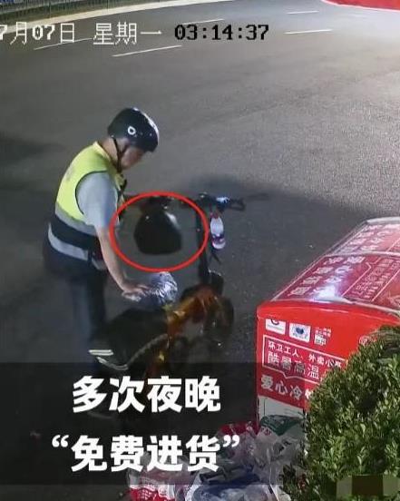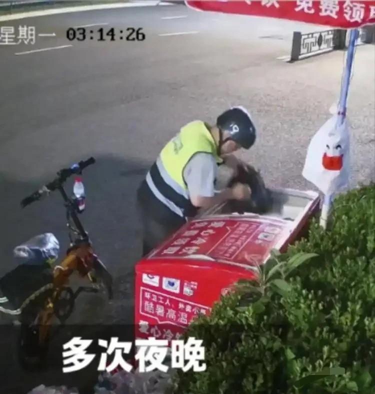 杭州一名代驾男子多次选择在凌晨三四点钟偷拿爱心矿泉水,而且每次都是满满的一大包,