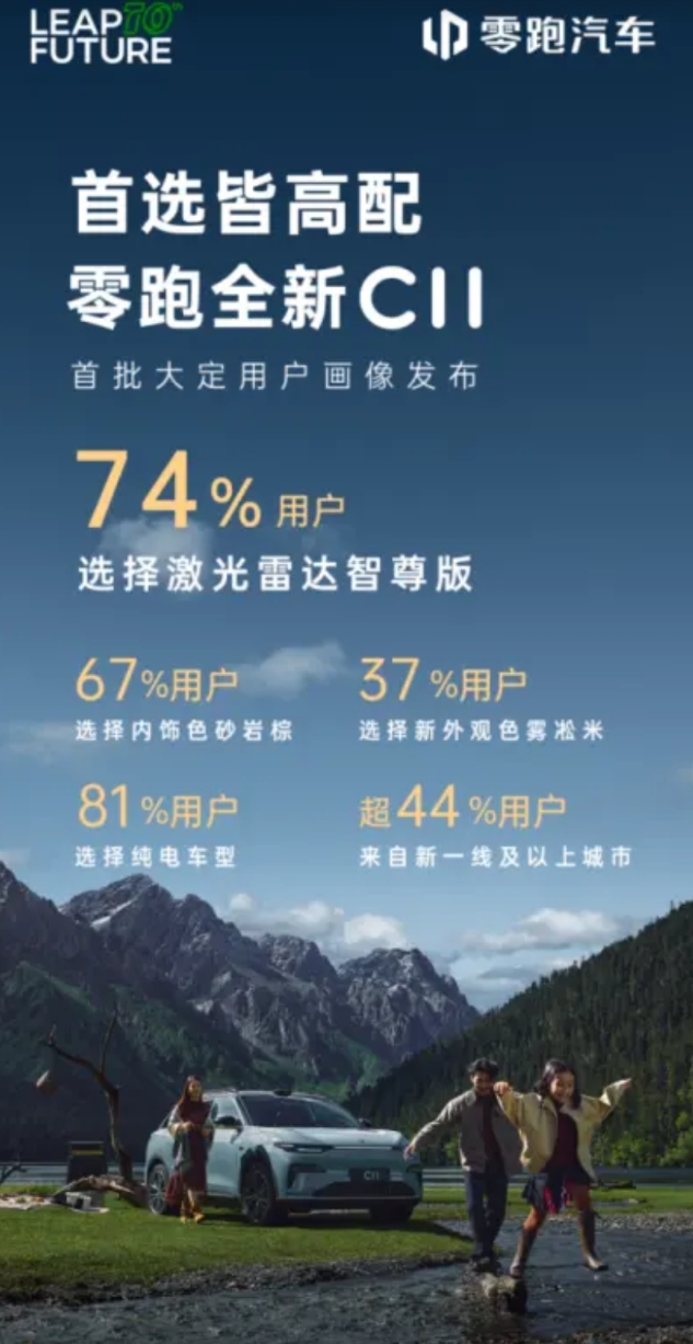 零跑稳居周榜前列,全新C11上市即建功? 零跑的销量表现真的太稳定了,在最新一周的销量榜单中,零跑交付0.82万台新车, 继续稳居新势力周榜前二,鸿蒙智行、理想、小米等几家也依旧占据着前排位置。其中鸿蒙智行自此问界M8上市之后,销量一直都比较稳定,小米在YU7上市后,交付量也慢慢提了上来。零跑能在这些强大对手的包围中稳居前二,这个月上市的全新C11发挥了很大功劳。 说到这款车,很多人都知道C11是零跑销量最好的车型之一,累计销量超过25万台,而在全新C11上市之后,这个纪录也在持续刷新。并且上周零跑新增定单10K,全新C11贡献颇多。 从官方公布的用户画像来看,选择全新C11纯电版的用户占比高达81%,这说明全新C11纯电版标配800V架构和640km超长续航,确实解决了很多用户的痛点,极大缓解了续航焦虑。此外,选择顶配版的用户也超过七成,看来大家对全新C11的高价值升级也是相当认可的。 毕竟全新C11除了续航给力外,激光雷达、端到端大模型辅助驾驶、60英寸AR-HUD等配置确实十分亮眼,还有Nappa真皮座椅、吸风式座椅通风等也极大提升了驾乘舒适性,相当于不到17万就能买到一辆满配车型。 所以,相信零跑7月以及下半年,也必然会再创新高。