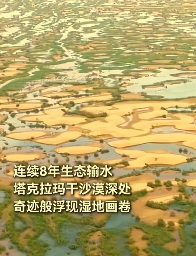 连续8年生态输水,让塔克拉玛干沙漠深处奇迹般浮现湿地画卷。塔克拉玛干沙漠变绿洲际
