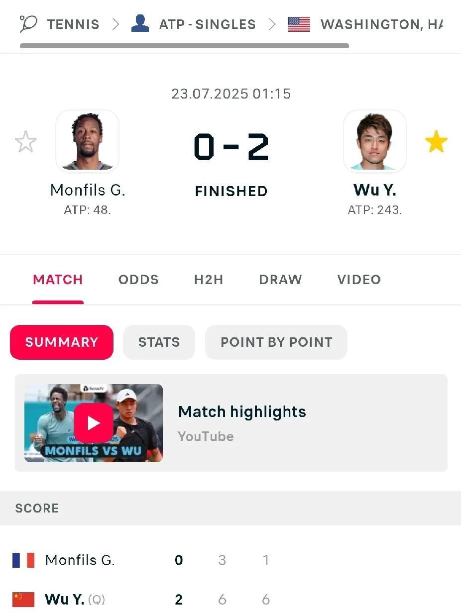 吴易昺、布云朝克特双双晋级ATP500华盛顿公开赛32强 吴易昺来到华盛顿已经连续三场获胜。资格赛两连胜后晋级正赛,正赛首轮就以6-3、6-1,战胜世界排名第48的法国老将孟菲尔斯。 另一名中国选手布云朝克特直接参加正赛,结果艰苦的拉锯战以6-4、7-5战胜世界排名第60名的戈芬,同样晋级32强。