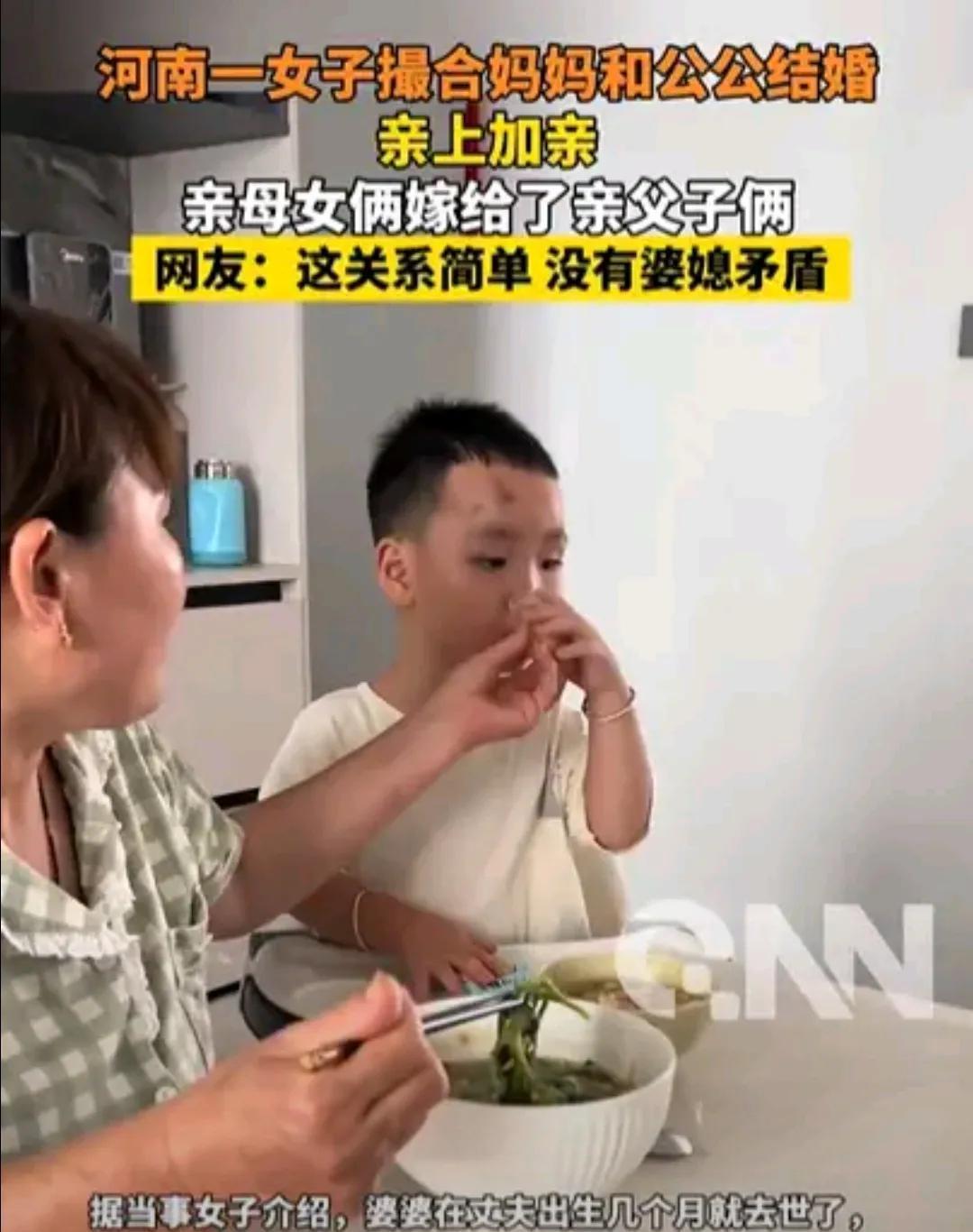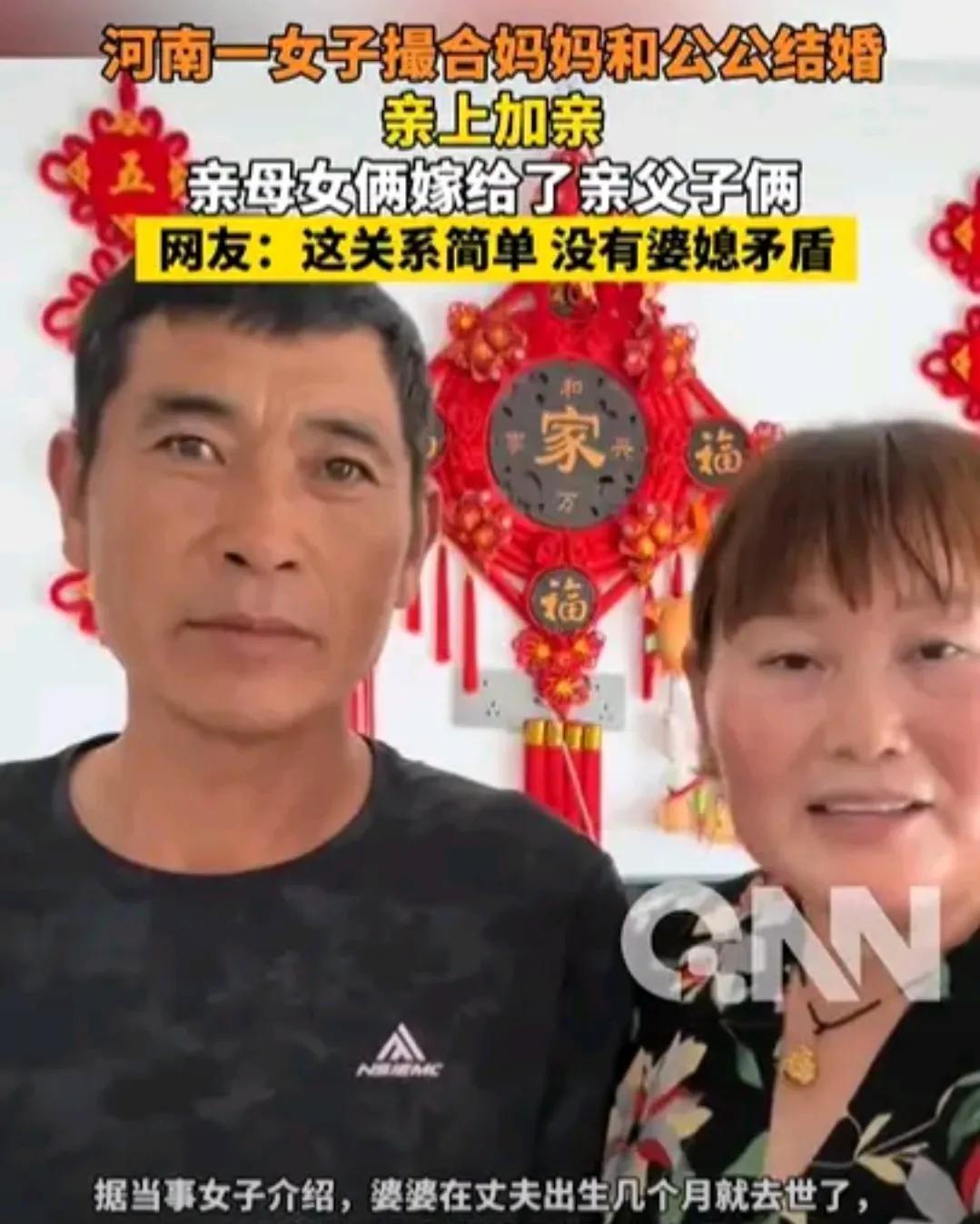 “太幸福了!”河南周口,一女子结婚后,发现公公人不错,就和老公商量,撮合自己的单身妈妈和单身公公结婚,没想到最后竟成了,两老人也乐意,亲母女俩嫁给了亲父子俩,亲上加亲,一家人其乐融融,女子也没有婆媳矛盾了! 女子嫁到老公家后,觉得公公人很好,她婆婆在老公出生后没多久就去世了,公公一直一个人生活,而女子的妈妈和爸爸离异了,她妈妈正好也是单身,怕两个老人孤单,女子和老公一商量,两人一拍即合,撮合女子公公和妈妈结婚了。 亲父子俩娶了亲母子俩,一家人其乐融融,家里还有个孙子,年轻人没家庭烦恼了,老人也不孤单了,孩子依旧爷爷奶奶地叫着,这个家太幸福了! 有网友说女子这样搞乱套了。但也有网友认为这样的结合很好,少了很多矛盾,称呼也简单多了。 其实只要两个老人合得来,这就是个好办法,这样的结合可遇不可求,这样的家庭的凝聚力很强,家人关系和谐,家庭幸福美满,女子成人之美,何乐不为! 愿女子一家幸福快乐下去!