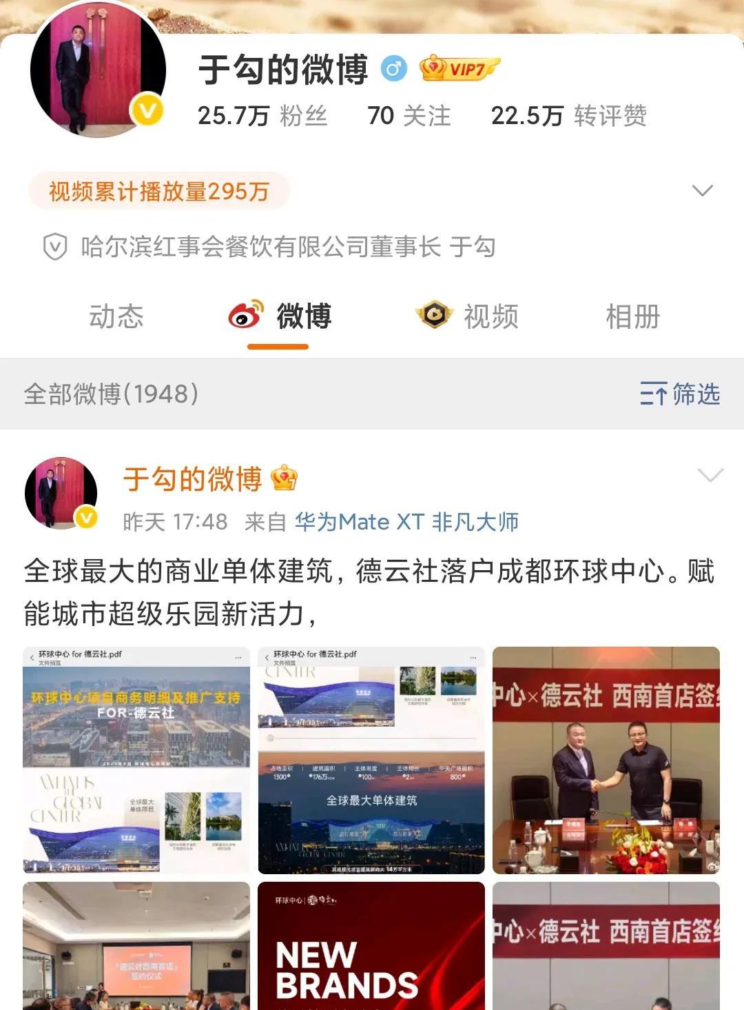 7月22日,德云社副总于勾发博官宣德云社入驻成都环球中心引起粉丝热议。 大家不要理解错了,这个官宣德云社不一定是剧场,而是餐饮。 因为于勾是做餐饮,跟郭德纲就在北京开了一家德云红事会馆。 签约仪式负责演出的都没有去,如果是剧场不应该是演出的负责。 而且,这种大单体不太适合剧场,管理租金成本太高。要是在成都环球中心里开家餐馆,那餐馆的利润是没有问题。