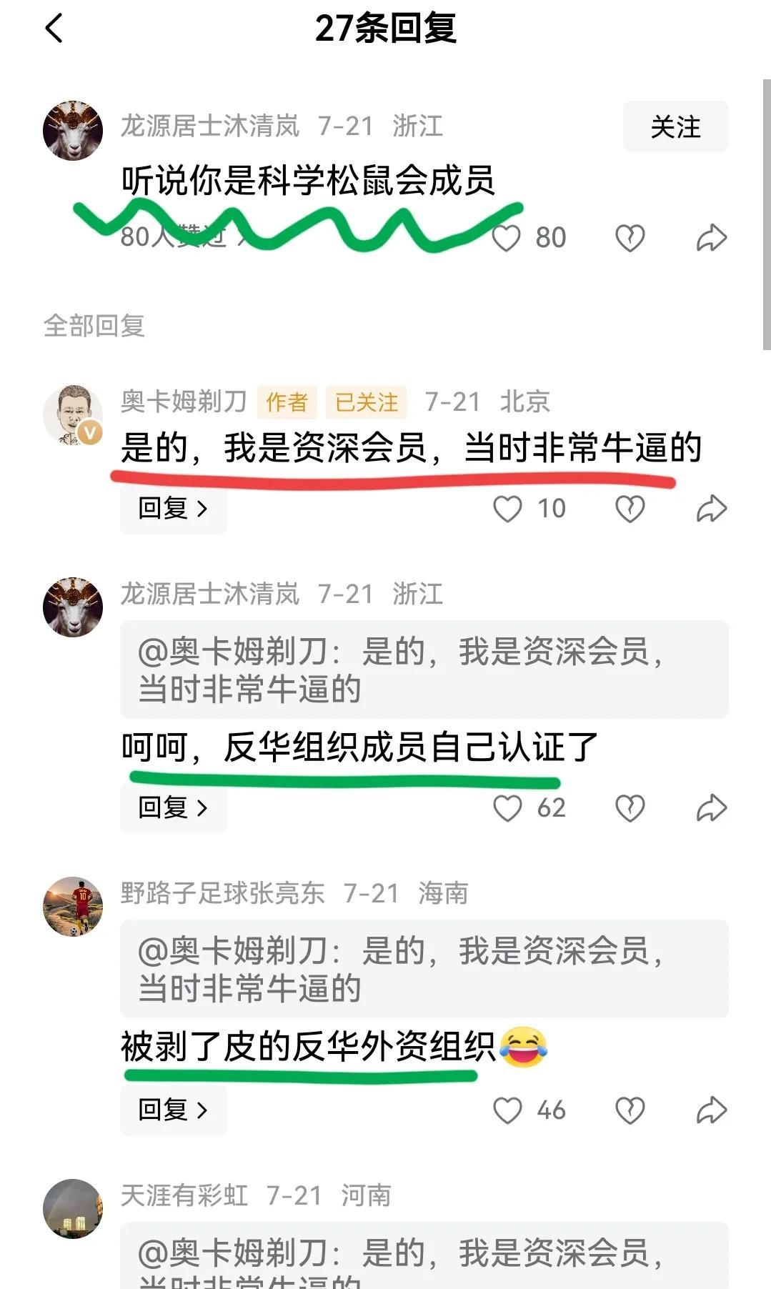 自负的奥卡姆剃刀又来了,但他说自己偏就不谈亚里士多德,还说“这是坑”。不对啊?这世上还有剃刀不敢谈的事? 开始耍小聪明小伎俩了。 一向给人无比自信,无比自负的剃刀,这是怎么了? 当剃刀被问是不是科学松鼠会成员时,剃刀承认了,还不忘说一句“我是资深会员,当时非常牛逼的”。 但当网友们接下来继续提问的时候,剃刀又沉默不语了。 而事实上,剃刀回答不了的何止一两个问题?他评论区里网友的很多问题他都回答不了,或者说,不敢如实回答。 你觉得呢?