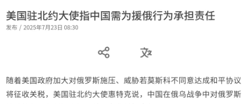 要追究中国的责任!7月22日,美国驻北约大使惠特克声称,中国认为他们正通过俄罗斯打一场代理战争,从中国政府的一些声明来看,他们似乎希望让美国及其盟友长期被这场战争拖住,好让我们无法集中应对其他战略挑战。我认为中国误判了形势。他们应为资助乌克兰战场上的杀戮承担责任,并应受到谴责。