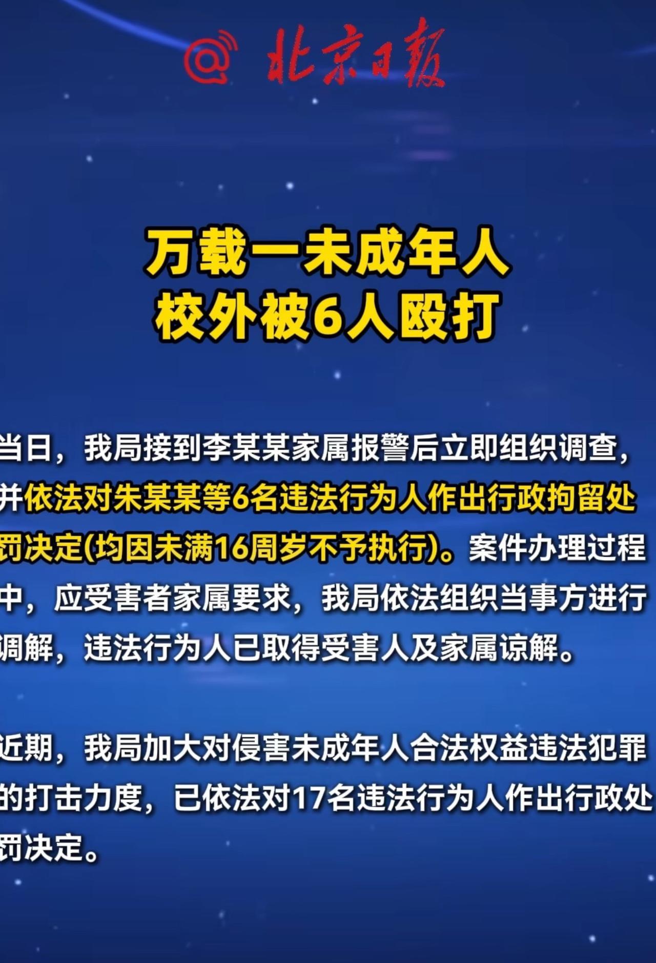 此事情曝光之后,众多网友纷纷表示,受害者为什么要谅解,不能刑事拘留,也能给他们留案底。再说了,不能拘留,赔偿费得n+++,对受害者来说不仅是身体上的伤害,心理伤害也很深!” 看到万载县这起未成年人校外被殴打的新闻,真的又心疼又气愤! 几个孩子把同学打成轻微伤,虽然够不上刑事处罚,但这行为已经越界了。法律规定未满16岁不执行行政拘留,这是出于对未成年人的保护,但也得让他们知道,犯错就得有代价。 光不拘留可能不够,是不是该有更严格的管教措施?比如,让家长承担更多责任,或者通过社区矫正让他们真正认识到错误。受害者不仅疼在身上,心里的疙瘩可能更难消,赔偿之外,一句真诚的道歉、必要的心理疏导也不能少。 法律对未成年人的保护,不应成为纵容犯罪的理由。不能只让受害者默默承受,那些犯错的孩子也得为自己的行为付出代价。当然,经受害者家属要求,警方组织调解,施暴方取得受害人及家属谅解,说这些都是后话了。 不过,好消息是新法有了突破,2026年1月生效的新《治安管理处罚法》规定,14-16岁未成年人若一年内二次违法或情节恶劣,可执行拘留。 大家觉得,对这类未成年人犯错,除了现有的处理方式,还该有哪些补充办法呢?#长沙新朋友# #寻美三湘#