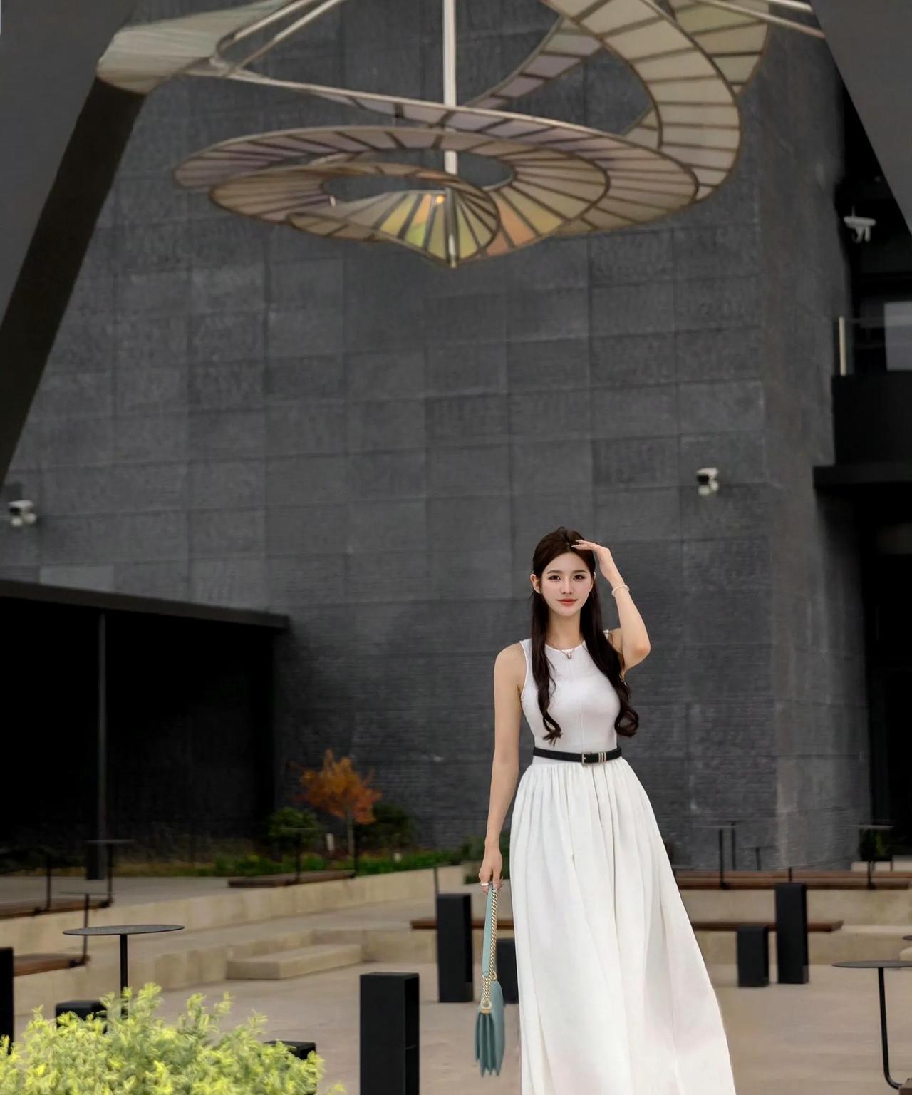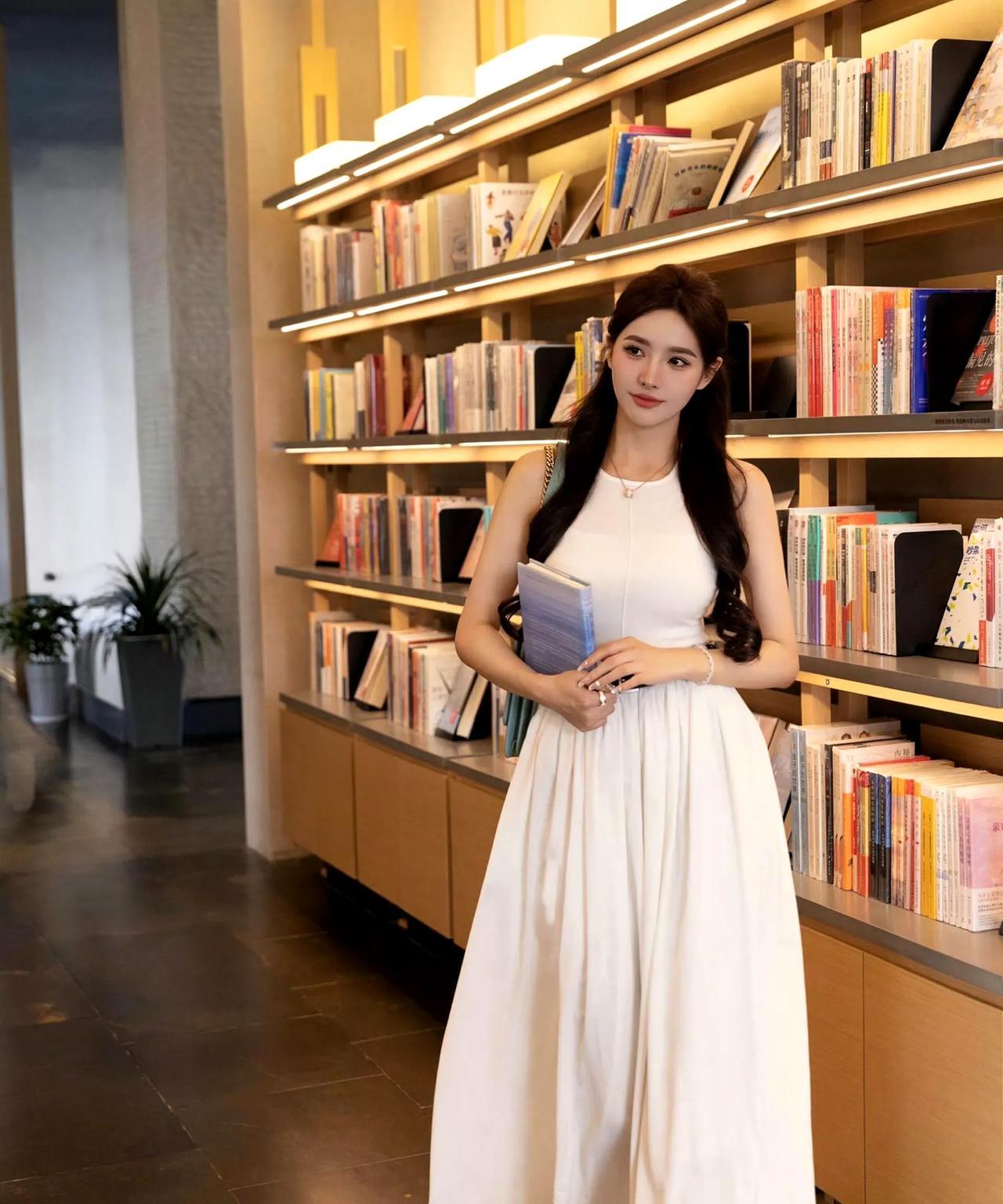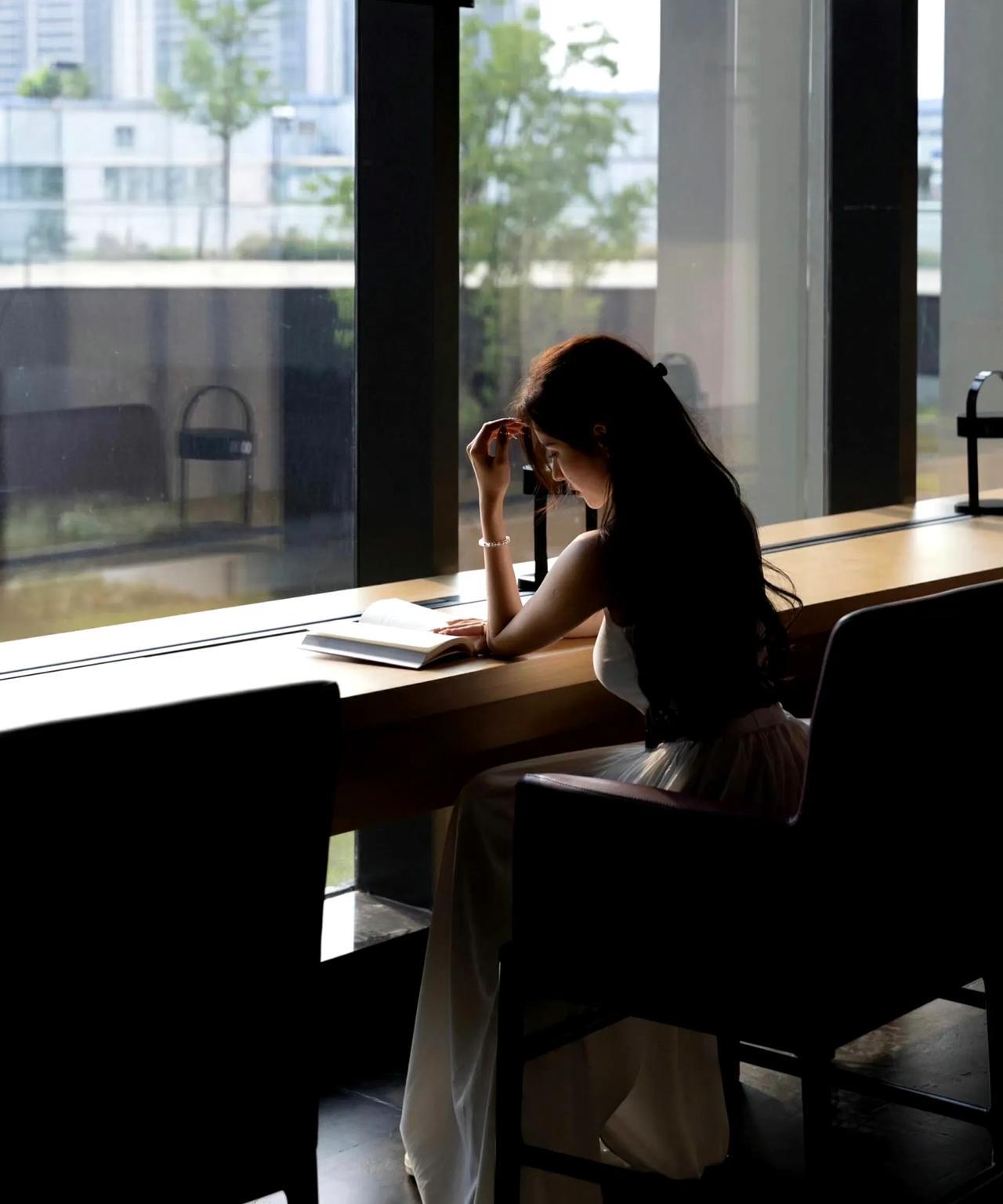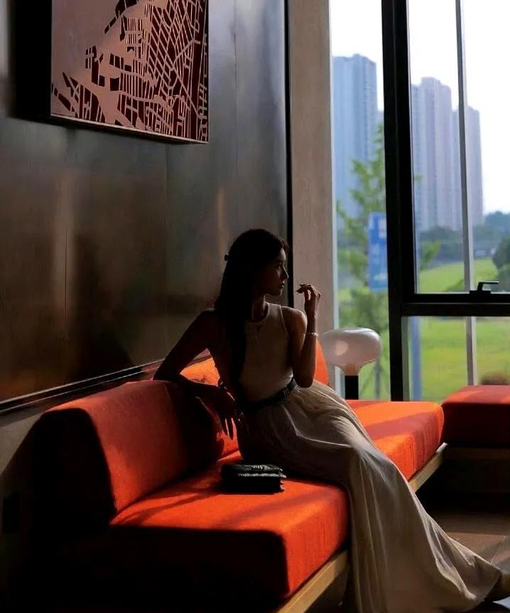 优雅白裙少女,静坐现代简约风客厅,自然光洒满整个画面。