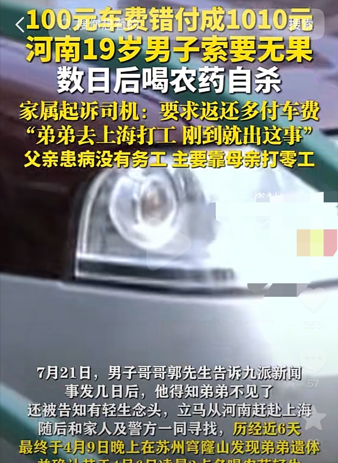 “良心不会痛吗?”上海,19岁男生准备进厂打工,打车到浦东新区,本与司机私下谈好100元,但付费时不小心付成1010元,给司机留言无回应,打电话也被挂断!几番索要无果,男生数日后服下农药自杀。网友:司机真缺德啊,多收的钱花着安心吗?