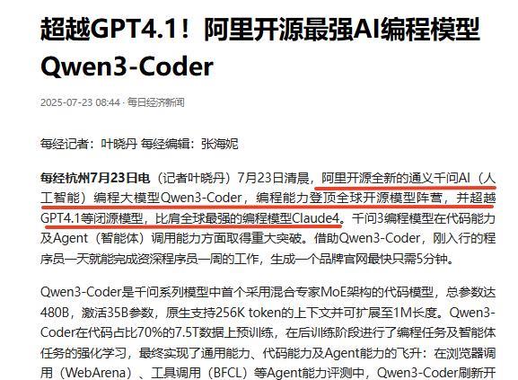 第一次工业革命,蒸汽机为标志,我们错过了; 第二次工业革命,内燃机为标志,我们错过了; 第三次工业革命是通信和互联网,我们抓住了尾巴,成功赶上来了 其实,每一次工业革命给社会带来最直观的变化就是生产力的变革, 包括如今,我们能在手机、电脑上办公、学习都得益于生产力得益于生产力的发展。 而在以人工智能、量子计算等技术为代表的第四次工业革命,也一定会带来生产力革命,会出现一些标志。现在来看,大家最先感知到的应该是AI的落地应用。 尤其刚刚看到阿里千问3编程模型正式发布,这个感触就更深了。虽然这两年各种大模型疯狂涌现,但是从应用来看,基本都停留在聊天、回答问题、生成图片及视频这些,并没有真正上参与到社会工作中。 而这次千问3编程模型就在编程领域颠覆了大家的认知,其性能打破了此前开源编程模型的记录,编程能力登顶全球开源模型阵营,并超越GPT4.1等闭源模型,与最强商业编程模型Claude4不相上下,更关键的是,千问3编程模型能够让程序员的生产效率提升10倍,我觉得这已经不能用提效来形容,而是真正的生产力革命。 要知道,程序员以往都是一个字符一个字符地敲代码,现在把一句话大白话给到千问3编程模型,就能实现复杂的编程功能。 试想一下,过去一个资深程序员花一个月才能完成的工作,现在一个初级点的程序员,只要一周就能完成,几分钟搞出一个炫酷的交互网站也完全有可能,这个跨越是非常大。 对于程序员群体来说,这样的模型可以帮助他们完成那些需要的耗费大量时间的繁琐过程,有更多精力去做创造性的东西,确实是件好事。门槛降低了,甚至普通人也有机会去接触编程。 不过,千问3编程模型带给我们的震撼只是一个开始,是一个信号,在这股势头下,制造、零售、金融等各行各业更大的发展机遇。