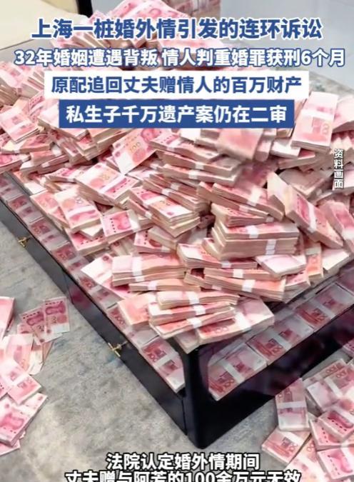 “白头偕老成了笑话!”上海,一女子意外发现,与自己结婚32年的丈夫,在外面还有一个比她小21岁的“妻子”,二人甚至还有一个3岁的儿子!女子无法接受,以重婚罪向法院起诉丈夫和第三者,谁知丈夫竟突然离世,导致案子被撤销。更令女子崩溃的是,第三者居然带着私生子来争夺千万遗产! 7月22日,上海松江区人民法院对外公布了一起复杂且“狗血”的判决书,引发网友热议。 上海的王阿姨(化名)与丈夫李某(化名)结婚32年,期间感情一直很好,本以为能白头到老,没想到却在晚年遭遇了最残酷的背叛。 丈夫不仅在外面找了个比她小21岁的情人,还生了个孩子,这让为了陪丈夫白手起家,最终没能要上孩子的王阿姨无法接受。 据王阿姨调查,自己的丈夫李某是在2014年的一次饭局上认识了年轻貌美的付某(化名)。 当时的王阿姨已经50多岁,李某也年近六旬,谁能想到这个年纪还会闹出这种事? 可没想到李某居然对这个三十岁出头的女人一见钟情,在生意伙伴的“撮合”下,付某和李某添加了好友,之后时不时地外出约会,两人打得火热。 后来因为付某怀孕的缘故,李某直接在2015年给付某在外面安置了一套房子,而付某也在同一年生下了个男孩。 对于这些事情,知情人士均保持沉默,甚至一些生意伙伴还帮着李某打掩护欺骗王阿姨,此时的王阿姨一直以为丈夫还是那个和自己白头偕老的“灵魂伴侣”。 2017年,李某以公司事务繁忙为由,告诉王阿姨需要在离公司更近的那套房子居住,但其实是跟付某还有私生子住在了一起。 直到2019年年底,王阿姨才偶然发现了这个惊天秘密,当时她得知丈夫背叛自己时气得浑身发抖,当即就委派私人律师帮忙进行调查,之后以重婚罪向法院起诉了丈夫和付某。 可就在案子审理期间,李某却突然因病去世,案件不得不撤销,而第三者在明知李某与王阿姨是夫妻的情况下破坏他人家庭,被法院判处有期徒刑六个月,缓刑一年。 就在阿姨还没从悲痛中缓过神来,付某又带着孩子找上门来,以儿子是李某留下的唯一血脉为由,张口就要分走丈夫留下房屋、商铺份额,折价款1000万以及车辆、股票等。 更糟心的是,那个3岁多的私生子确实享有继承权,王阿姨想不通,自己辛苦经营32年的家,凭什么要让给破坏她家庭的人? 王阿姨实在是气不过,于是以付某与丈夫的婚外情有悖公序良俗,伤害了她的身心健康为由,起诉付某,要求对方对自己进行赔偿,可却遭到了法院的驳回。 目前关于李某遗产继承分配的纠纷问题,法院正在审理中,具体结果需等待官方公告。 对此,大家又是如何看待的呢? (信息来源:极目新闻——2025-07-22《结婚32年女子发现丈夫出轨,丈夫去世后情人因重婚罪获刑,私生子起诉索要千万遗产》)