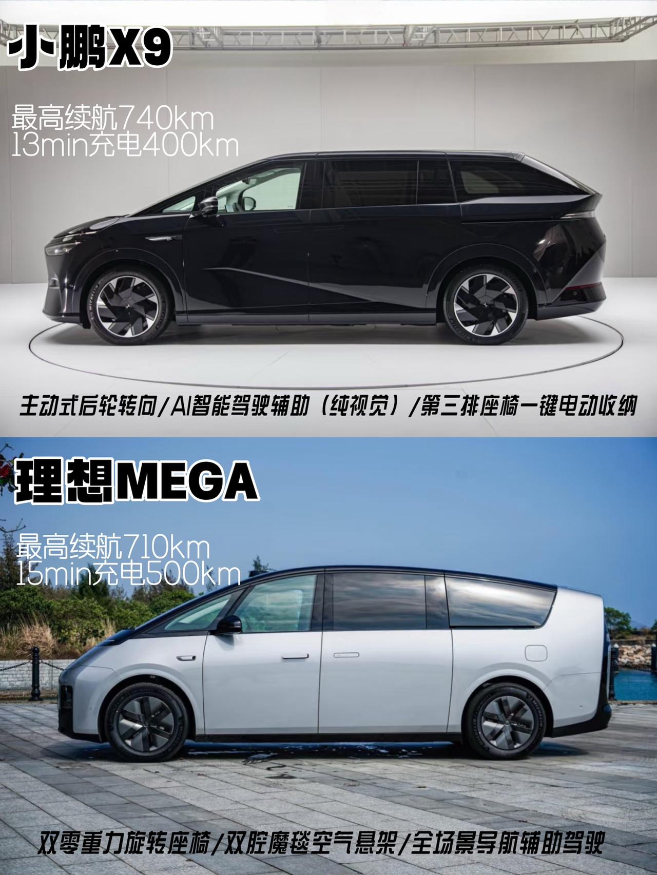 纠结纯电MPV的看过来!拿小鹏X9和理想MEGA 直接硬刚,看完选车不迷糊👇 💰 价格&销量:钱包和市场的双重投票 • 小鹏X9:35.98万起,全年销量21141 ,价格亲民+市场认可,预算友好型选手 • 理想MEGA:52.98万起,全年销量11425 ,高价门槛在这,销量也稍逊一筹 🔋 续航&补能:长途/快充谁更稳 • 小鹏X9:最高续航740km ,13min快充补能400km ,日常通勤、短途出游都够使,快充效率也在线 • 理想MEGA:最高续航710km ,15min快充补能500km ,续航稍短,但快充补能更猛,看你更在意续航长度还是补能速度 🚗 操控&配置:开着爽+坐着舒服才是王道 • 小鹏X9:转弯半径5.4m ,双腔空气悬架+CDC +6个液压衬套 ,还有主动式后轮转向、纯视觉智驾,灵活好开,第三排座椅一键收纳超方便 • 理想MEGA:转弯半径6.35m ,双腔空气悬架+CDC ,双零重力旋转座椅、全场景导航辅助驾驶 ,座椅玩法多,操控灵活性略输X9 总结一下!预算有限、想要高性价比+灵活操控,选小鹏X9;预算充足、追求独特座椅体验+超快充,考虑理想MEGA ~纯电MPV这波对比,你更pick谁?