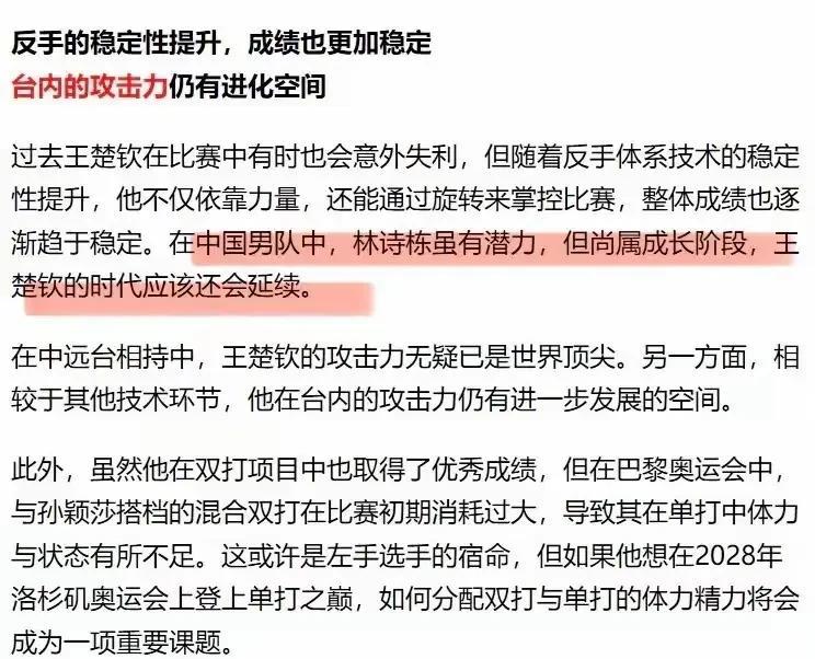 韦晴光评价王楚钦的时代还会延续。 他的反手技战术体系稳步提升。 韦晴光是何许人也? 他是1988年韩城奥运会中国首枚奥运金牌获得者,培养了左手林昀儒。 他还提醒如果王楚钦想在2028年 洛杉矶奥运会上登上单打之巅, 如何分配双打与单打的体力精力将会 成为一项重要课题。 他提出林诗栋虽然有潜力但他还处在成长阶段,毕竟外协当中的菲利克斯勒布伦,张本智和,雨果,他还过不去,他前面还有好几个人。 左手能能冲出来不容易,左手将大多有自己的宿命,就是配合右手双打。 就像王楚钦,单打之前,他已经获得了双打,混双大满贯。 所以王楚钦的多哈世锦赛冠军才更有含金量。 毕竟,他创造了历史! 经并且有预感,他的左手还会在洛杉矶奥运上再次创造历史。