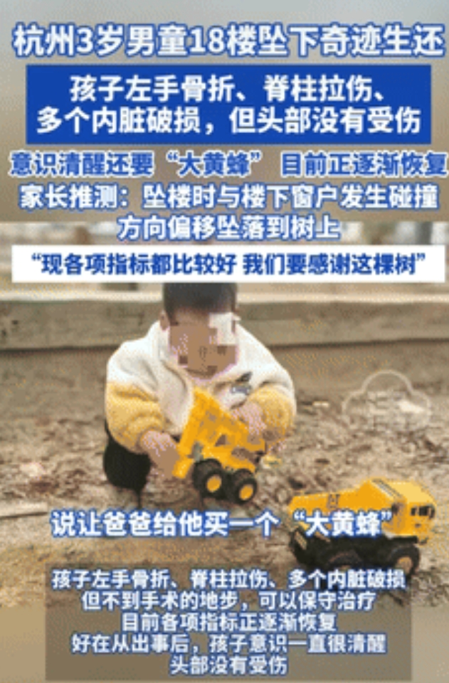 “命真大!”浙江杭州,一3岁男孩不慎从18楼坠落至楼下,送医检查后,发现孩子左手骨折、脊柱拉伤,但头部没受到伤害,可以保守治疗,男孩醒后还向父亲要“大黄蜂”,而男孩奇迹生还的原因竟是因为它,网友:老祖宗关系够硬! “如果不是这棵树我儿子真的可能活不成了,现在想想都感到后怕!”男子心有余悸的说道,7月15日下午一场突如其来的意外让这个家庭陷入绝望,但最终在一系列的幸运和奇迹中,3岁的男童竟奇迹生还,这起事件不仅牵动了无数人的心,更引发了对高层住宅儿童安全问题的深刻反思。 事情发生在7月15日下午3点左右,杭州某小区18楼的朱先生家中,当时孩子午睡醒来,家中只有年迈的老人看护,老人以为孩子还在熟睡,想着去楼下买点菜很快就回来,为了防止孩子乱跑,便反锁了房门出去了,然而老人刚离开没多久,意外就发生了。 孩子醒来后发现自己被反锁在房间内,房门打不开,情急之下,他跑到卫生间,踩着马桶试图爬上窗户,令人痛心的是家中的窗户并没有安装限位器或防盗网,这样的疏忽成为了悲剧的导火索,孩子一不小心从窗户翻出,径直坠向楼下。 据小区物业工作人员介绍,孩子坠楼后最先发现的是小区的一位阿姨,她看到地上躺着一个孩子,立即拍下视频发到物业群里,物业工作人员迅速报警并协助将孩子送往医院,朱先生也是在看到物业群里的视频后,才惊觉自己的儿子出了事。 “起初打死我都不信他是从18楼掉下去的,后来是让物业调取了监控才确认,”朱先生回忆道,监控画面显示,孩子从18楼坠落的过程令人触目惊心,但更令人难以置信的是,他竟然还能生还。 在坠落过程中孩子经历了一系列的“幸运”,朱先生推测,孩子掉落过程中,可能是被17楼打开的窗户阻拦了一下,导致掉下去的位置发生了偏移,这一偏移,让孩子没有直接坠落在坚硬的水泥地上,而是挂在了楼下的树上。 那棵树成为了孩子生命的“救命树”,树枝的缓冲大大减轻了下坠的冲击力,使得孩子避免了直接撞击地面的致命伤害,朱先生事后特意向这棵“救命树”献上了一朵大红花,以表达感激之情。 经医院检查,孩子左手骨折、脊柱拉伤、多个内脏受损,但幸运的是,头部没有受到明显伤害,意识始终清醒,医生表示,孩子的情况虽然严重,但好在没有生命危险,可以进行保守治疗,目前,孩子各项指标都在好转,正逐渐恢复。 “孩子还跟医生讲,让爸爸给他买‘大黄蜂’,”朱先生说道,这句话让人不禁泪目,尽管经历了如此惊险的事件,孩子醒来后想的还是自己喜欢的玩具,这份天真和乐观,也让整个家庭看到了希望。 这起事件在网络上引发了广泛讨论,网友们纷纷为孩子的奇迹生还感到庆幸,一位网友留言道:“看到这个新闻真的吓出一身冷汗,太幸运了孩子没事,但同时也替所有高层住户捏一把汗,家里一定要装好防护措施,不能有侥幸心理,孩子的生命只有一次,安全真的不能忽视。” 另一位网友则感慨道:“这孩子真是命大啊!挂到树上有缓冲,头部没受伤,还能醒来说要‘大黄蜂’,网友说‘老祖宗关系够硬’,其实不是,是安全防护和幸运之神眷顾了,但这样的幸运不是每次都有,家长一定要提高安全意识,别等悲剧发生才后悔。” 这起18楼坠落的奇迹生还事件,让人既揪心又庆幸,揪心的是孩子所受的痛苦和家庭的惊恐,庆幸的是孩子最终化险为夷,然而我们更应从中吸取教训,提高安全意识,为孩子们创造一个更加安全的成长环境,生命只有一次,安全无小事,愿每个家庭都能筑牢生命防线,让这样的“奇迹”不再需要发。 对此你怎么看?欢迎大家在评论区留言讨论。