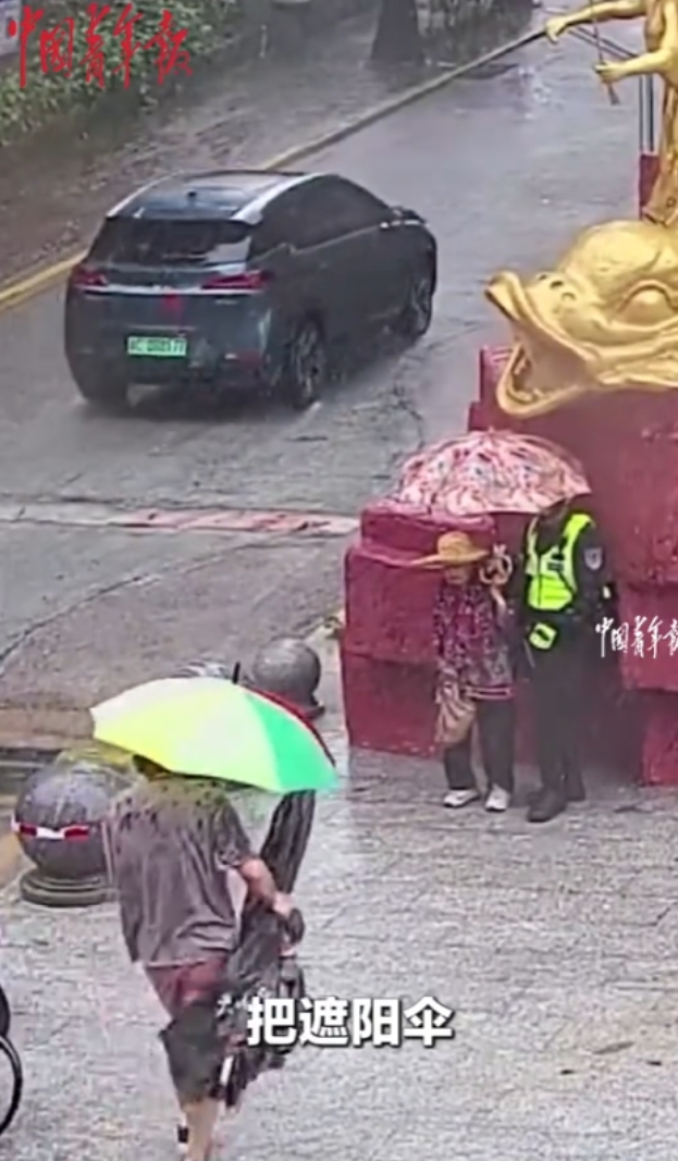 交警赶紧把老奶奶和轮椅推到路边一处相对遮雨的地方,让老人先躲躲雨,这时候,附近一家商店的老板在店里看到了这一幕,他二话不说,从店里拿出一把大号的遮阳伞,撑着就冲进了雨里。