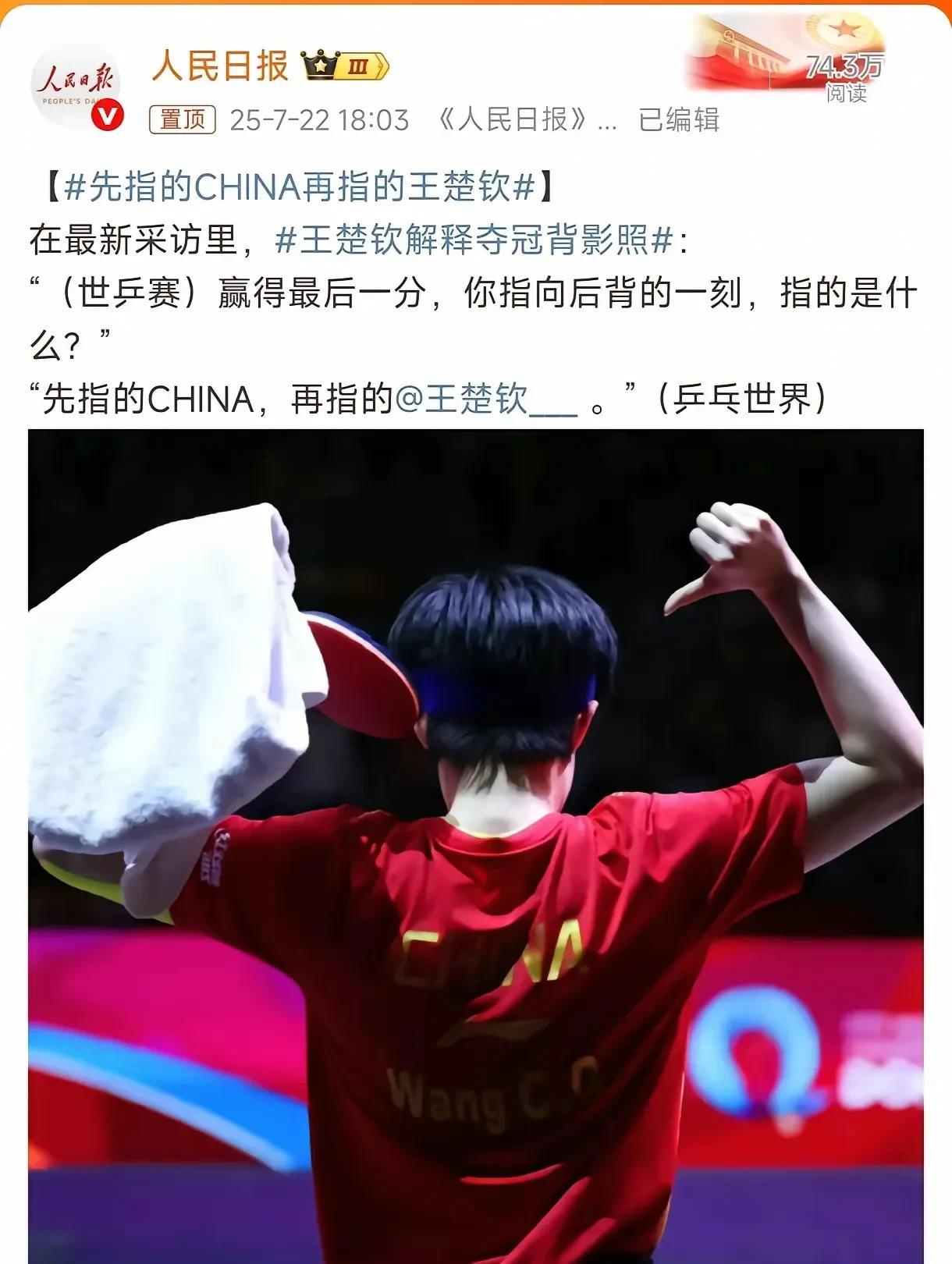 有没有被王楚钦的这个动作感动到, 先指的China!再指王楚钦! 人民日报和中国
