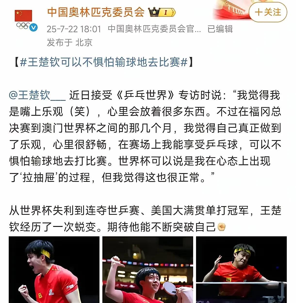 有没有被王楚钦的这个动作感动到, 先指的China!再指王楚钦! 人民日报和中国奥林匹克又发王楚钦的专题文了, 通过看王楚钦采访, 感觉他的心路历程分以下几个阶段 第一阶段,巴奥回国到福冈总决赛, 这个阶段连拿球拍都恐惧,无数次想放弃。 第二阶段,福冈总决赛到世界杯,这期间,心里顺舒畅了,也很乐观。 第三阶段,世界杯到世锦赛夺冠后,这个属于直接蜕变了,到达了一种境界了!