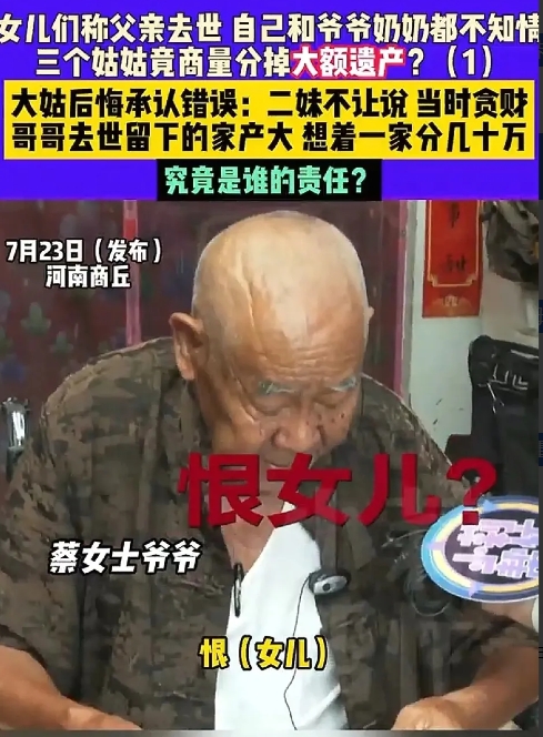 遗产包括价值五十万的房子,给了二姑姑的儿子,存款三万七,还有工资卡里的钱给了三个妹妹。 其他两个姑姑也分的几万的元,已经退还给两个侄女。 爷爷坐在轮椅上悲愤的说,没让我见儿子最后一面,我恨她,她是有预谋、有诡计、有计谋的做这些事情。希望二妹妹与侄女们坐下来谈一谈,不要去打官司。