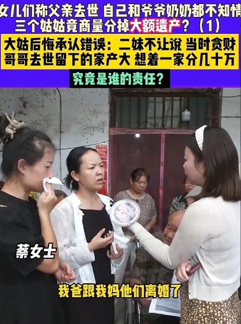哥哥车祸去世,三个妹妹不通知父母,和两个侄女,偷偷分了哥哥的遗产。 小妹妹觉得拿了这个钱“扎手”,把这件事告诉了两个侄女,大妹妹也赞同小妹妹的做法,说道:“我那时缺钱,也是贪心啊,真不应该拿那些钱。” 两个人给侄女道歉并且获得原谅。 小妹妹说,分哥哥遗产的事,是二妹妹提出来的,不通知父母和侄女们哥哥去世的消息,也是二妹妹的主意。
